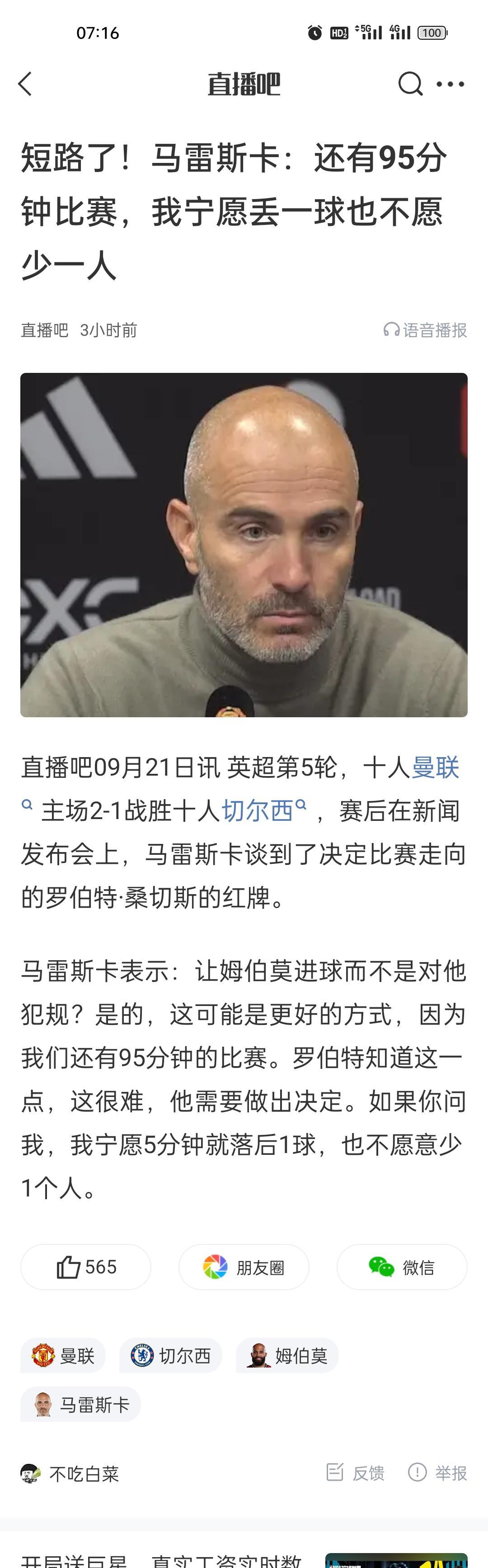 短路了!马雷斯卡:还有95分钟比赛,我宁愿丢一球也不愿少一人。