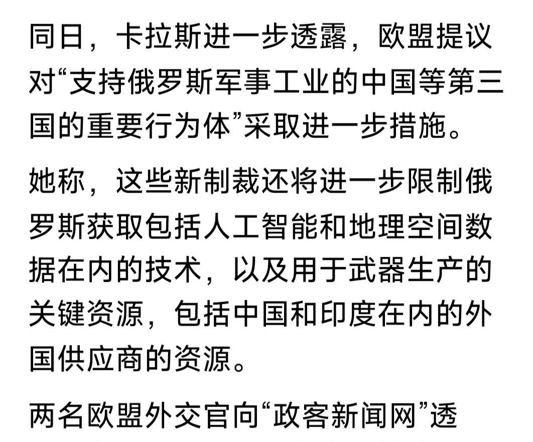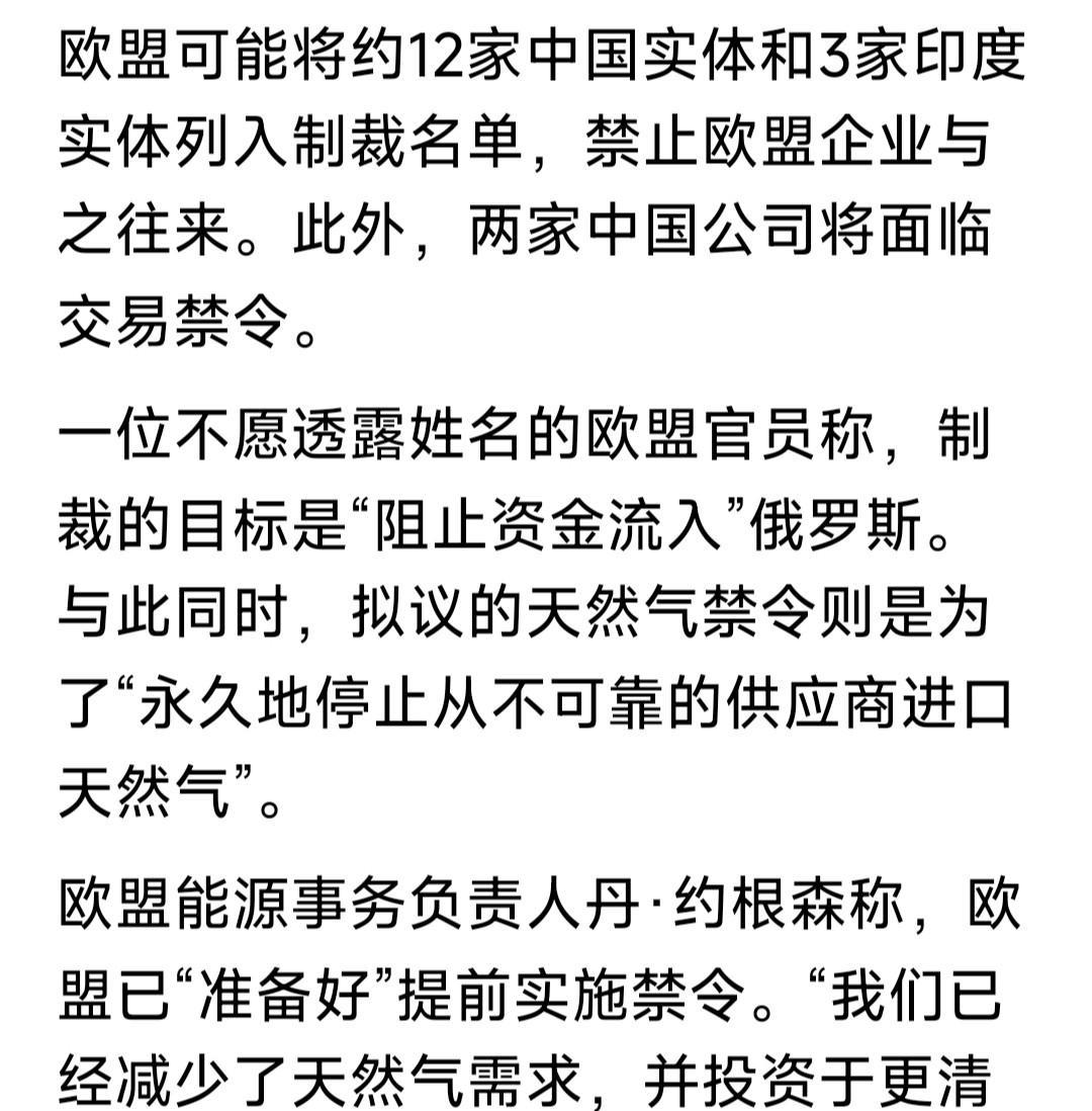 乌战危害持续外溢!继中欧班列波白关闭之后,欧盟通过对俄第19轮制裁,并对中印15家企业实施出口管制。 该轮制裁决议已通过,待成员国议会批准后实施。这次制裁意在摧毁俄经济,使其无资金来源继续支撑战争。 这次制裁涉及中印15家企业,包括油气经营商,炼油厂与石化公司等。同时对AI技术与通讯电子产品,加大检查力度,全面阻断此产品输俄通道。 这轮制裁是应川普要求,对俄实施“二级制裁”行动。但并未对中印实施全面“制裁”,只对中国12家,印度3家企业制裁。是否顾忌伤害中欧贸易? 尽管如此,对中国伤害已足够大!这12家企业,都是大型油气运营,冶炼与销售公司。再加上AI技术与通讯电子产品的阻断,对中国经济伤害极大! 都是俄乌战争惹的祸!就是这场战争,让不少中俄正常贸易,变成了“为俄经济输血”,“为俄乌战争递刀子”!让美欧乌不满,使中国遭受巨大损失! 这是一场不该发生的战争!为什么会发生?为何无人阻止得了?安理会几次谴责决议被否决!联合国大会几次通过决议,要求无条件撤军,为何不撤? 搞笑的是,安理会刚通过决议,要求加沙无条件停火,停止“屠杀”,解决人道灾难危机!遭美国否决后,各国一片谴责之声。为何没有谴责俄乌战争? 以哈冲突与俄乌战争,都是不该发生的战争!发生原因是何?为何不谴责罪魁祸首?却把反恐说成“恶行”?出现人道灾难怪谁?是以色列还是哈马斯? 联合国宪章与国际法,都认为侵略与恐暴是反人类罪!反侵略与反恐暴是正义的!为何俄乌战争与以哈冲突,却被颠倒过来了呢?实在令人无法理解! 无论如何,这两场战争都应尽快结束!拖延下去危害极大,后患无穷!只有尽快结束,才能恢复和平,惠顾民生。解铃还须系铃人,世界应共同努力! …………