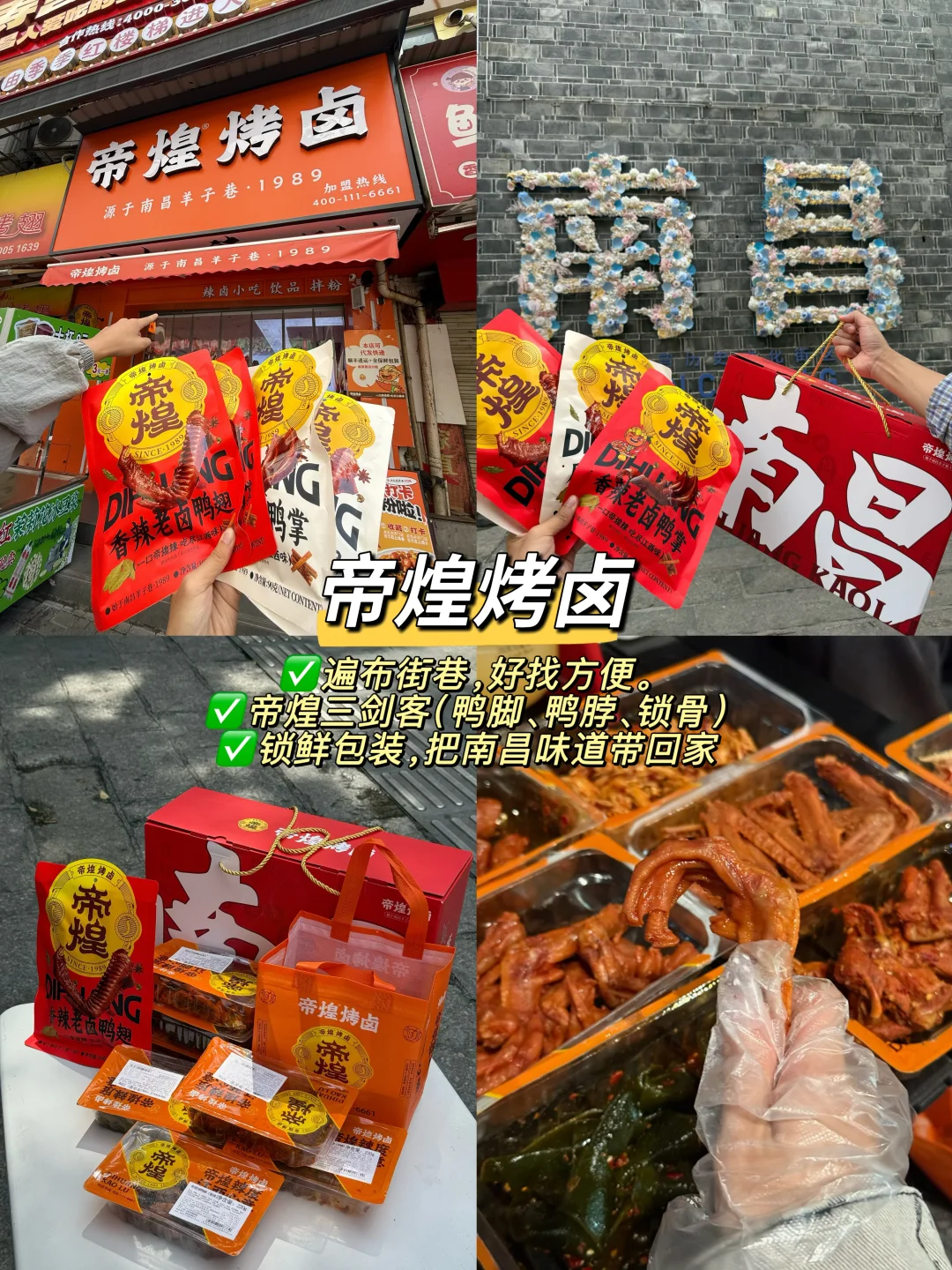 遍布街巷,好找方便。招牌帝煌三剑客(鸭脚、鸭脖、锁骨)挑战江西辣度,辣得过瘾,根本停不下来。还有特产装可以当伴手礼,再配上南昌字样冰箱贴,把江西味带回家。