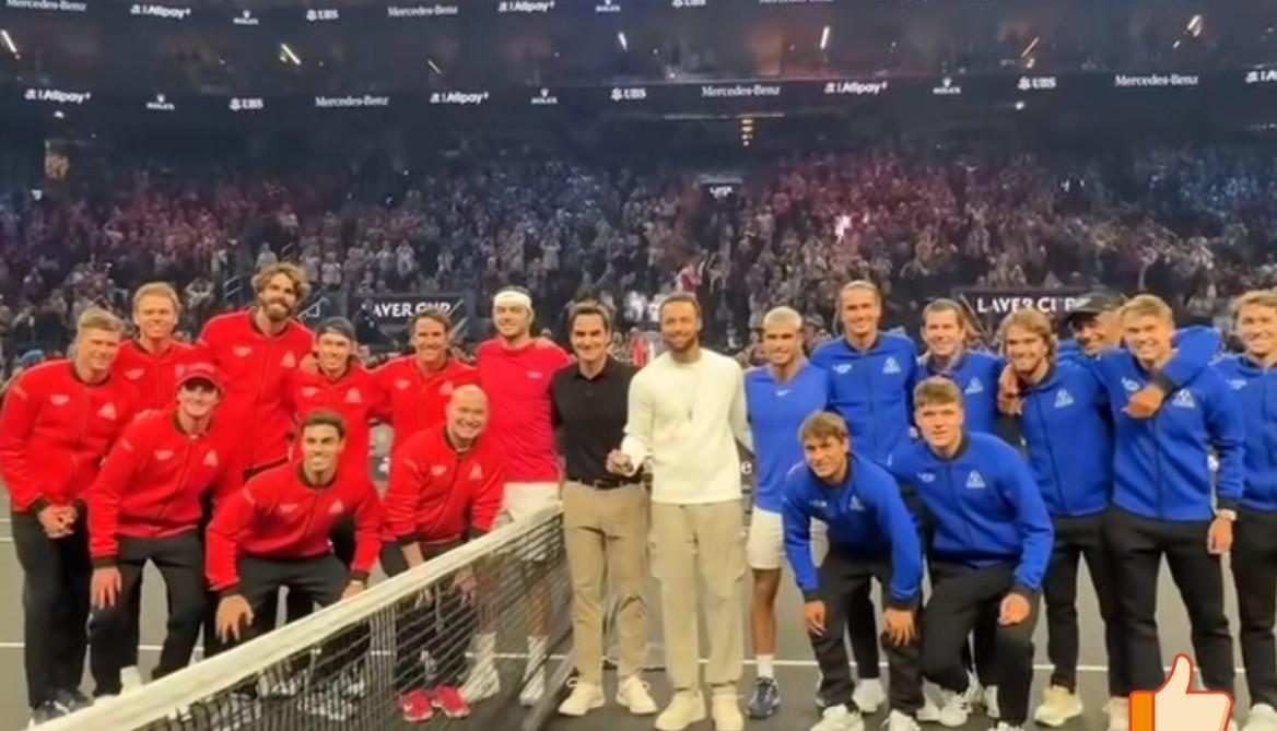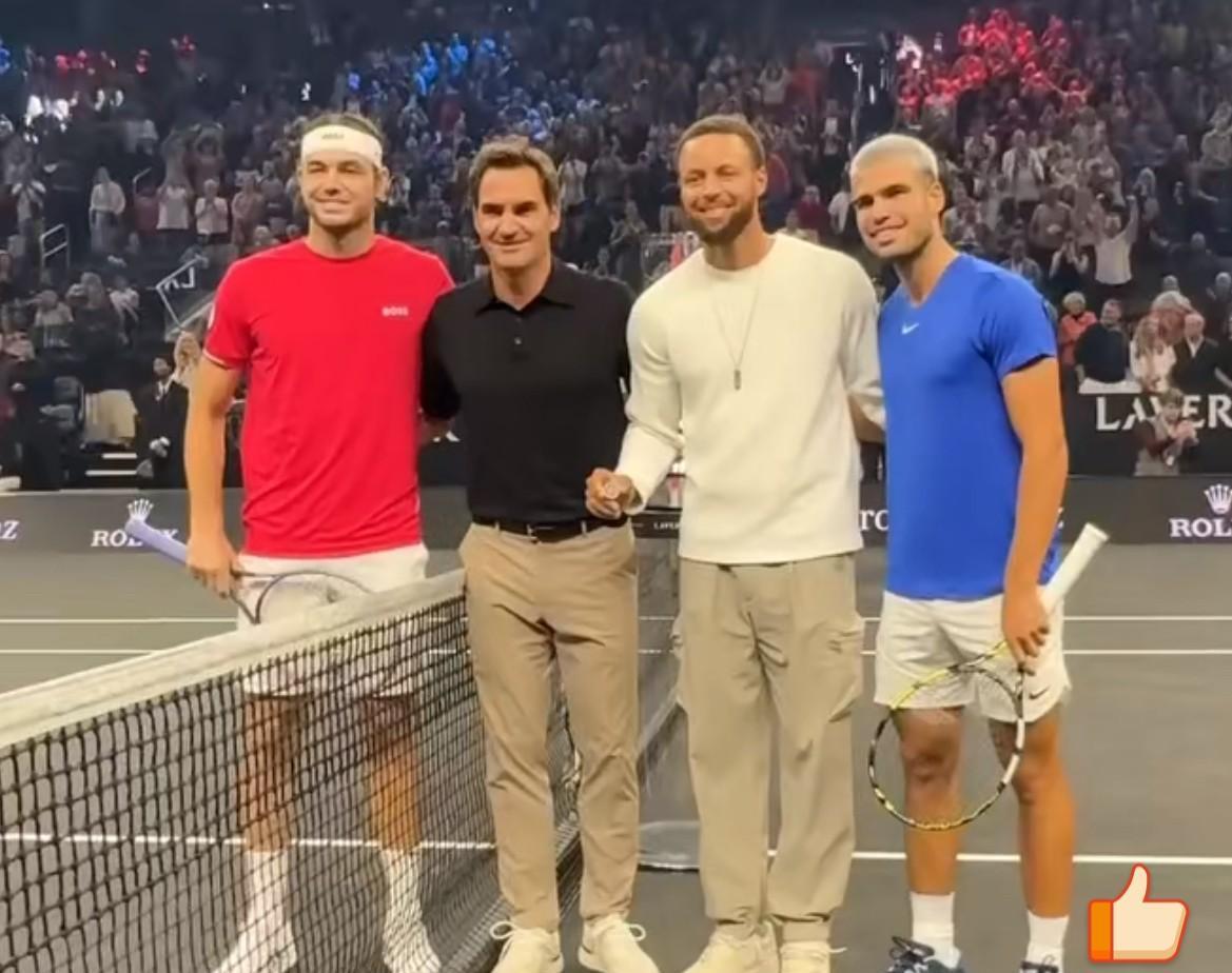 这应该是史上最多人数的网球挑边后的合影! 因为斯蒂芬·库里(Stephen Curry) 因为费德勒(Roger Federer) 挑边结束后的合影环节世界队和欧洲队的球员们蜂拥而上,留下珍贵照片。 受此鼓舞,代表世界队出战的弗里茨弗里茨 6-3/6-2 阿尔卡拉斯,这是弗里茨生涯首胜世界第一,同时也终结了阿卡13连胜。
