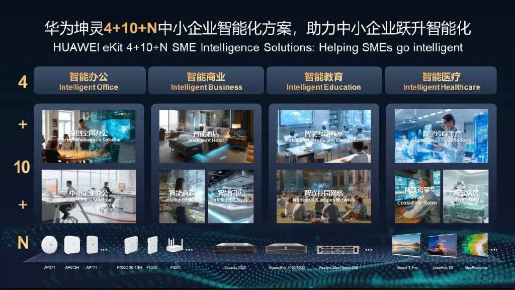 华为坤灵的答案是“4+10+N”中小企业智能化方案,其中的“4”是指智能办公、智能商业、智能教育和智能医疗四大场景。