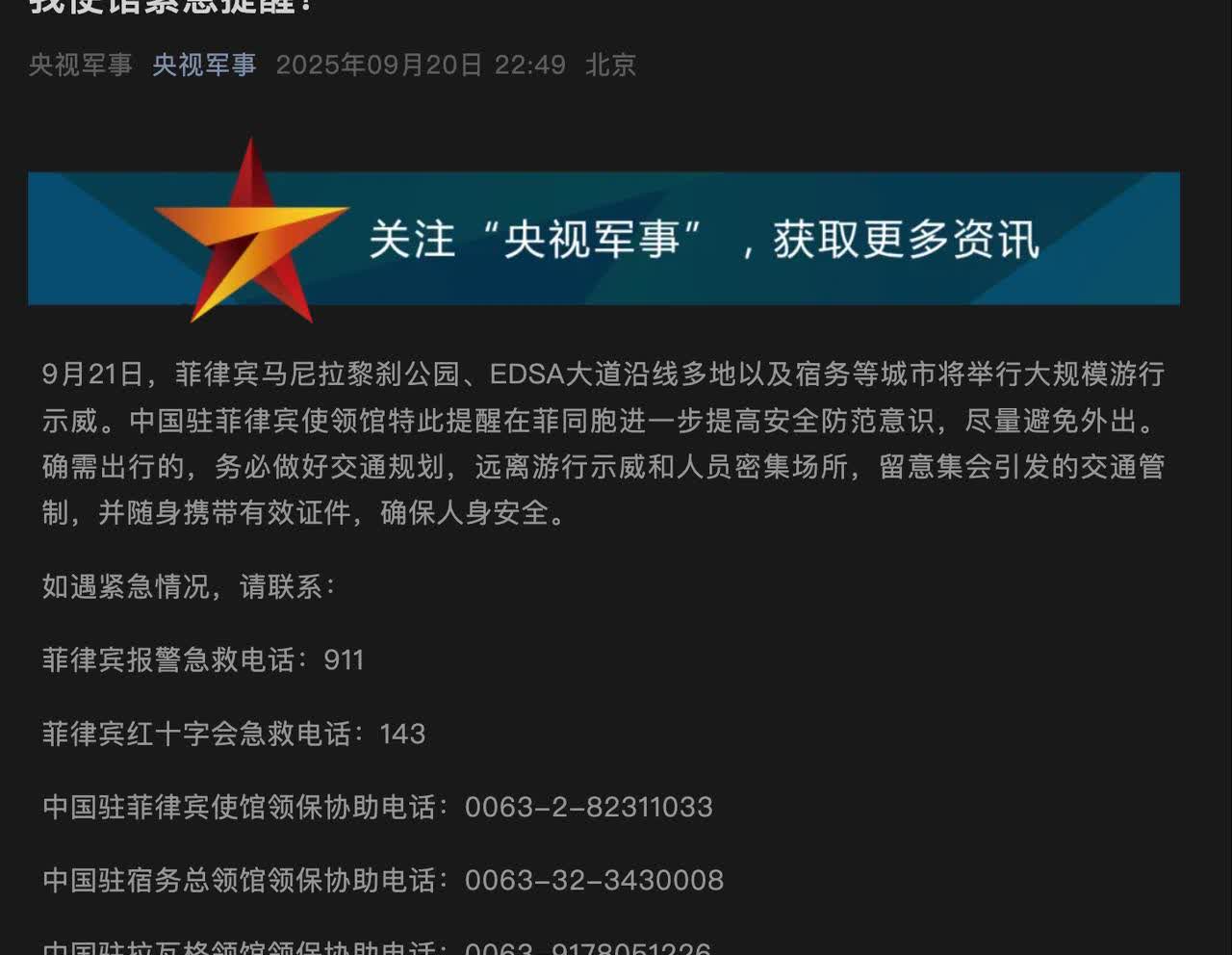 菲律宾暗流涌动,我使馆深夜发布安全提醒,这说明菲律宾内部有一股势力正在蠢蠢欲动,试图使用危险方式达到不可告人的目的。 中方在多个层面提醒菲律宾,但是其内部还有一些政客试图以挑衅中方达到讨好域外国家的目的。现在其国内搞的所谓的抗议,一方面与洪水项目贪腐有关,另一方面就是小马科斯等阵营搞出的民粹。 所以,提醒很重要,也希望同胞们能够按照提醒要求做好规划,保障自己的安全。