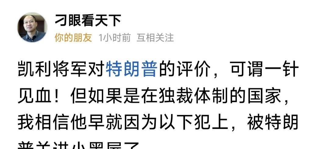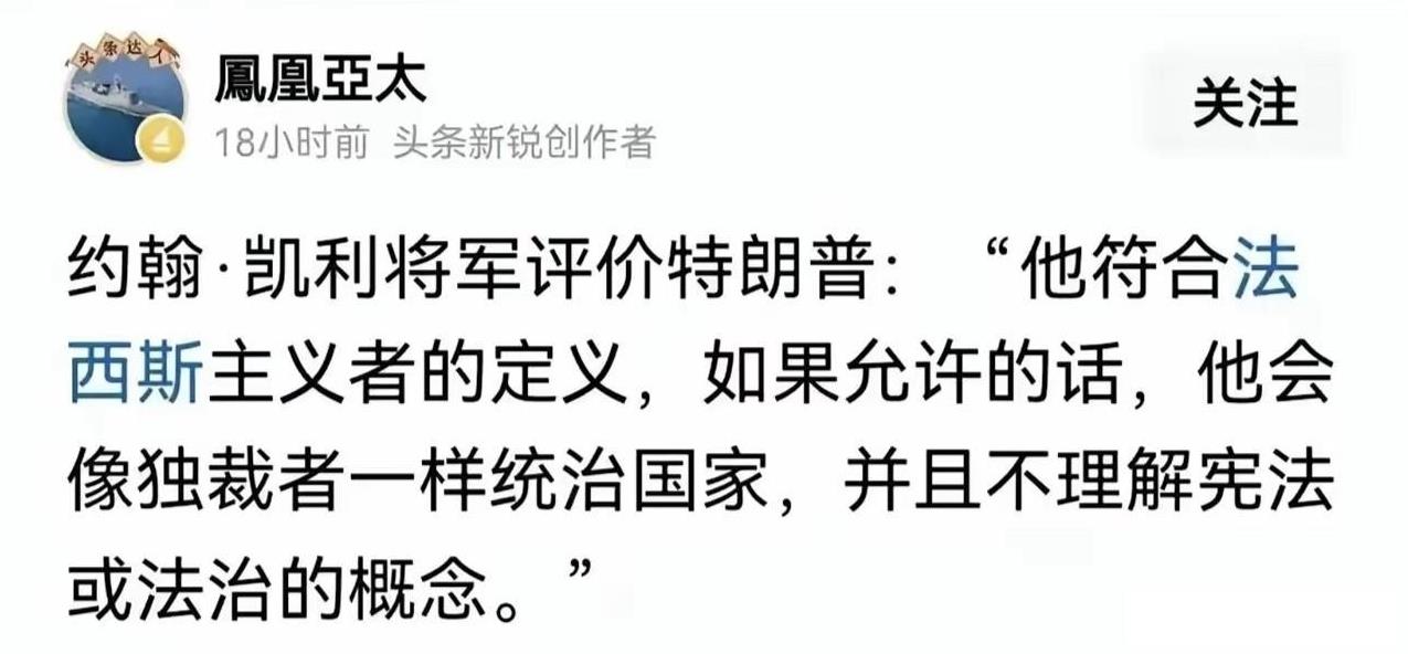凯利将军石破天惊,竟敢诋毁特朗普:他符合法西斯主义者的定义,如果环境允许的话,他会像独裁者一样统治国家,因为他不理解宪法或法治概念! 约翰.凯利将军,是美国海军陆战队退役上将,曾任美国土安全部长,白宫办公室主任。是美国政坛响当当硬邦邦,令人敬重敬畏的重量级政坛人物。 他的这句话看似平淡,却锋锐如刀尖利无比,活脱脱说出特朗普内心世界。他重返白宫后的一言一行,对俄争与以哈冲突的态度多变,不就是这样吗? 好在特朗普只是孙猴子,无论本事再大有七十二变,也逃不出“如来佛”的“五指山”!这个“如来佛”是谁?就是美国参众两院,与选他上台的美人民! 如果没有这个“如来佛”管着,让老特无法无天肆意妄为,说不定真会变成“独裁者”,根据个人好恶,处理国内外事务,美国与世界说不定真乱了呢! 有网友评论此事,凯利将军有点以下犯上了!幸亏是在老美,“诋毁”特朗普没事!如在萨达姆卡扎菲时代,或者哈梅治下,恐怕早就进“小黑屋”了吧? …………