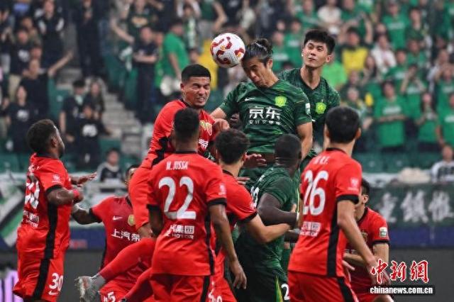 9月21日,双方球员在比赛中争顶头球。当日,在北京举行的2025赛季中超联赛第25轮比赛中,北京国安主场2:3不敌上海海港。中新社记者赵文宇摄