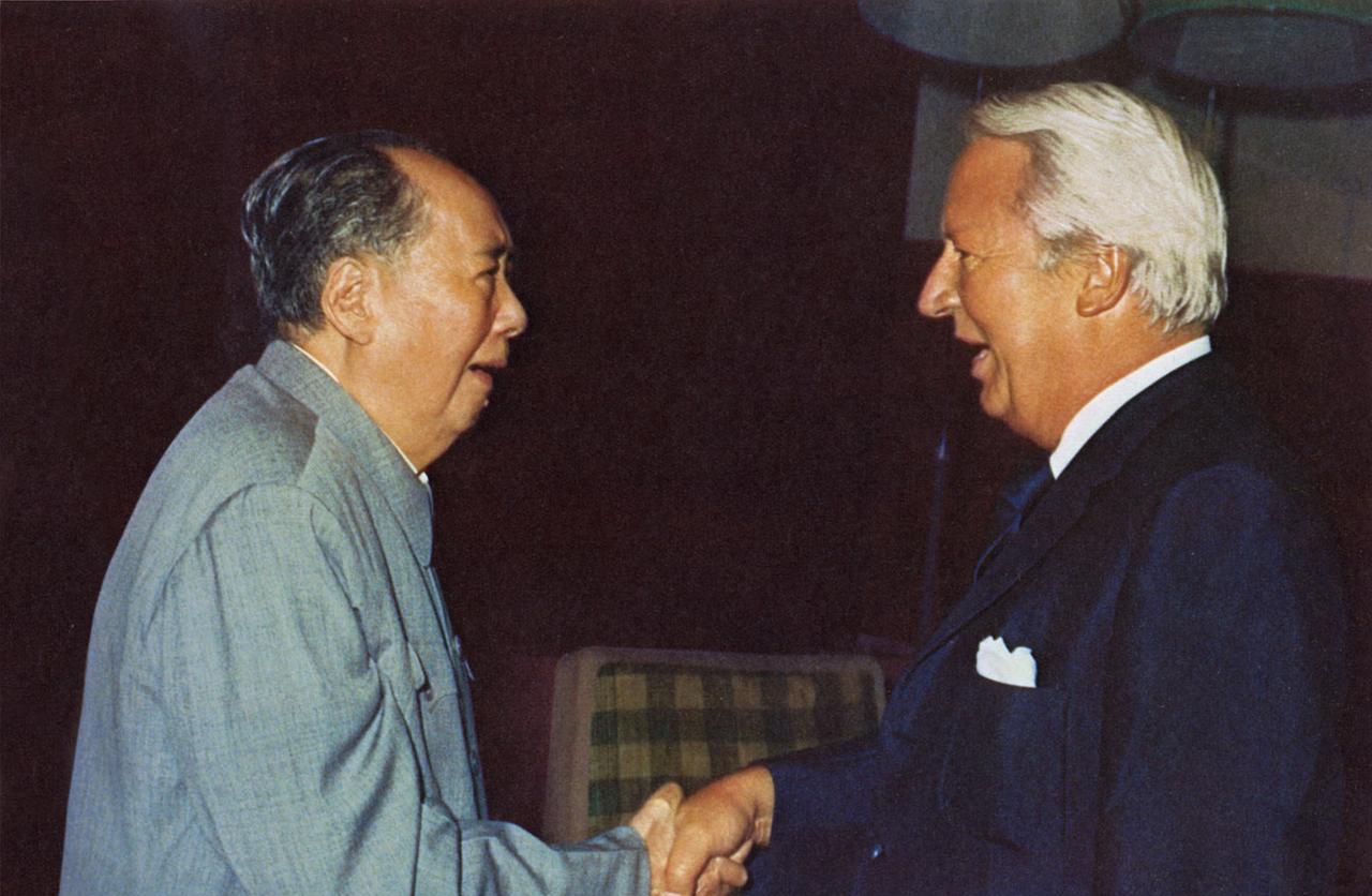 这一张老照片的拍摄时间是1975年9月21日上午。 毛主席接见英国前首相希思,谈话握手。 会谈时在座的有王海容、唐闻生等。