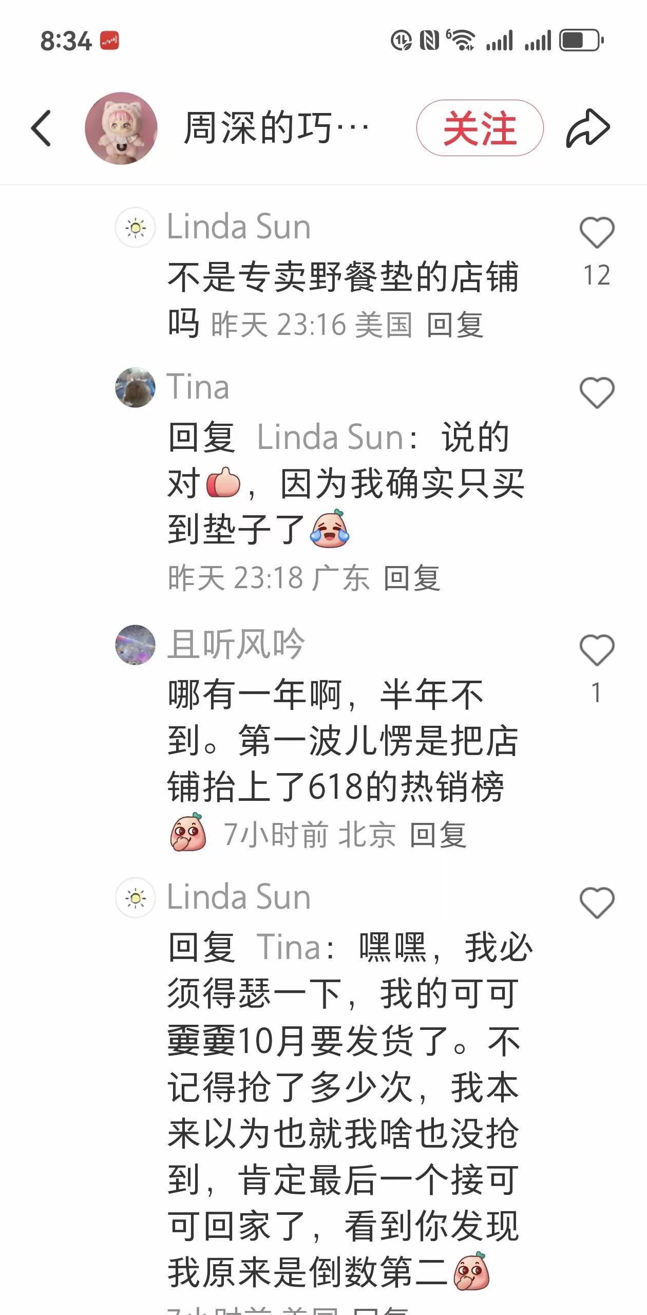 萱妞:可可嫑嫑,你们知道大家是怎么调侃你们开的店的吗?[微笑] 周嫑嫑:调侃?[惊呆]我和可可开的周可可旗舰店不好吗?[可怜] 萱妞:我特地去看了下你们店,除了因为预售的关系,物流分低了些,其它都满分!真太牛了![赞] 周可可:那为什么调侃?[what] 萱妞:大家取笑你们,每个月只补货一次,不少产品制定了限购一件。可都卖几个月了,购买时长恐怕都不足1分钟![我想静静] 特别是你俩造型的玩偶和包包,加起来恐怕30秒都没哇![打脸] 超过3秒下单,八成就抢不到了![泪奔] 在路人眼里,这就是个卖野餐垫的店![困] 周可可:[尬笑] 萱妞:还好!第一批的货我都买到了![大金牙]上次买的T恤和棒球帽也赶紧发货吧![微笑]免得物流分又降了! 周嫑嫑:[打脸]