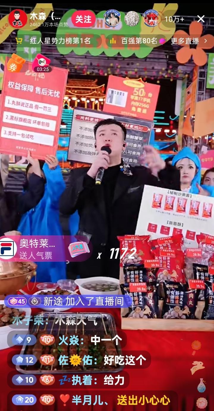 木森大舞台直播。当地正好下雨,所以就即兴来一组联唱经典歌曲《三月里的小雨》,那气氛烘托的简直是太有画面感。木森大舞台的节目每天并不是一成不变。有时候是选秀,有时候是现场两队比赛,由观众投票决定胜负。其实,最好看的还是开场节目,几轮下来,人气就十万+(大几十万)。直到带货环节,人数仍然是十万+。