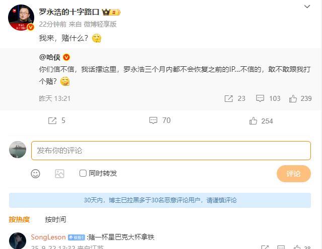 9月22日,罗永浩发文预告新一期的节目!不过IP地址依旧是中国香港。 有网友发文:罗永浩三个月内都不会恢复之前的IP…不信的,可以打赌?[做鬼脸] 罗永浩留言回复:不信,赌什么?[抠鼻] 网友::赌一杯星巴克中杯拿铁。[捂脸] 网友提问题,网友解答,完美闭环。