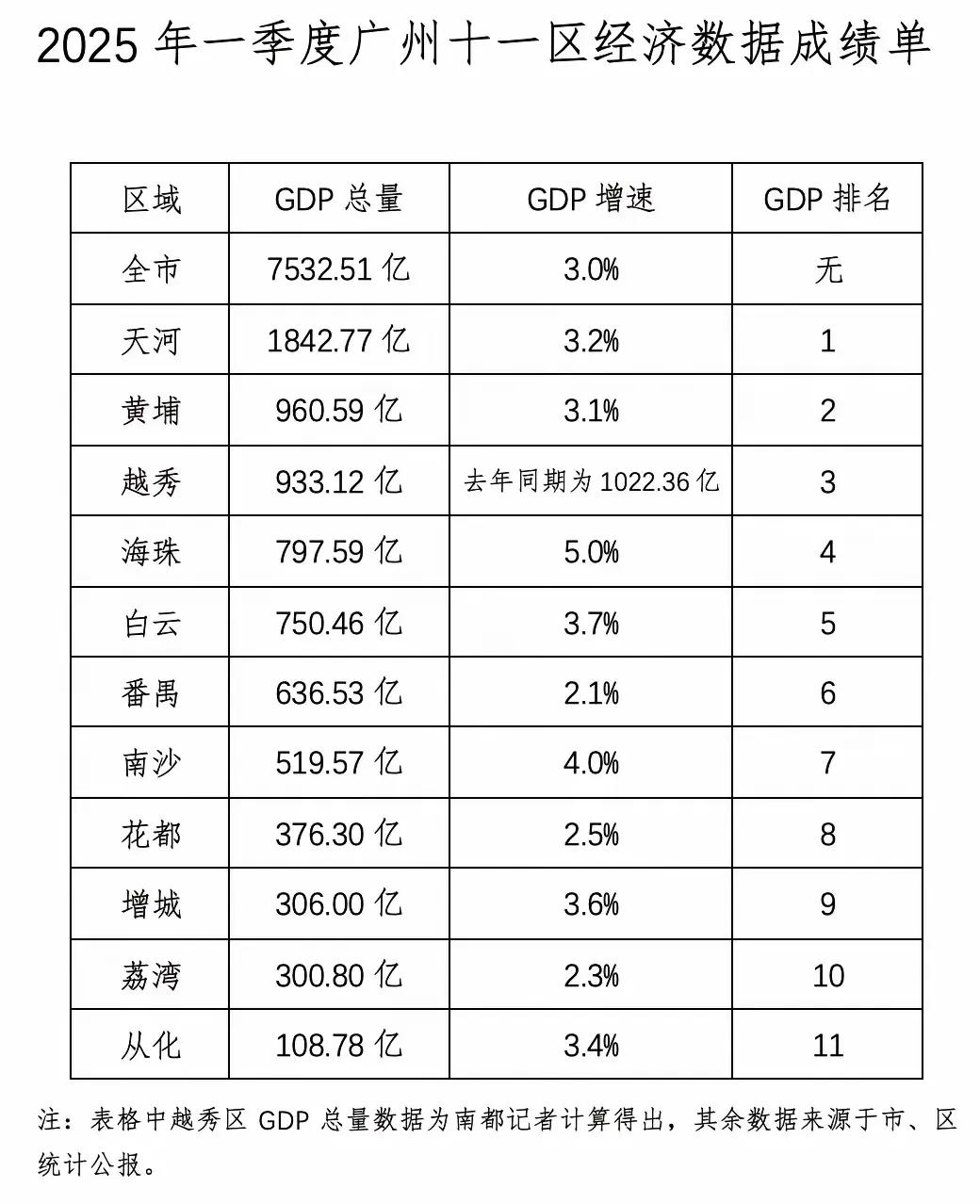 2025年第一季度广州各区GDP情况及亮点分析 整体情况:2025年第一季度广州市GDP总量达7532.51亿,增速为3.0% 。从各区表现看,呈现出一定的梯次分布。 头部区域: 天河区以1842.77亿的GDP总量位居榜首,增速为3.2%,在经济规模上遥遥领先,彰显其作为广州经济强区的地位,在产业集聚、总部经济等方面优势明显。 黄埔区GDP总量960.59亿排名第二,增速3.1% ,作为重要的产业集聚区,在工业制造、新兴产业等领域贡献突出。 越秀区GDP总量933.12亿排第三,虽去年同期数据对比显示有所变化,但依然保持在前列,其金融、商贸、文化等服务业底蕴深厚。 中部梯队:海珠、白云、番禺、南沙等区GDP总量处于中等水平。 海珠区GDP总量797.59亿,增速达5.0%,是增速较快的区域之一,在数字经济、创新产业等方面发力成效初显。 白云区GDP总量750.46亿,增速3.7%,凭借其物流、商贸等传统优势产业和不断推进的产业升级,保持稳定增长。 番禺区GDP总量636.53亿,增速2.1% ,在汽车制造、珠宝首饰等产业基础上,积极探索新的经济增长点。 南沙区GDP总量519.57亿,增速4.0% ,作为国家级新区,在政策利好下,不断推进产业导入和基础设施建设,发展潜力较大。 尾部区域:花都、增城、荔湾、从化等区GDP总量相对靠后。 花都区GDP总量376.30亿,增速2.5% ;增城区GDP总量306.00亿,增速3.6% ;荔湾区GDP总量300.80亿,增速2.3% ;从化区GDP总量108.78亿,增速3.4% 。这些区域虽经济规模较小,但也在各自特色产业上努力,如花都的汽车产业、增城的制造业、荔湾的商贸文化产业、从化的生态旅游等,且部分区域增速表现尚可,具备发展后劲。 亮点分析: 一是海珠区增速亮眼,5.0%的增速反映其在新兴产业培育上的成果,有望成为新的经济增长极。 二是黄埔区、南沙区等产业集聚区,在产业转型和新兴产业布局上持续推进,增速稳定且具有较大发展空间。 三是部分传统强区如天河、越秀等,在巩固优势产业的同时,不断探索新的经济增长点,维持经济稳定增长。