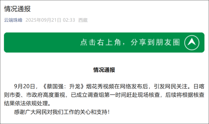 9月21日,“云端珠峰”官方微信发布通报,称《蔡国强:升龙》烟花秀视频在网络发布后,引发网民关注。日喀则市委、市政府高度重视,已成立调查组第一时间赶赴现场核查,后续将根据核查结果依法依规处理。