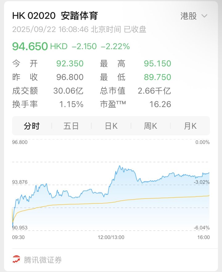 始祖鸟的“炸山”事件还在发酵。9月22日,安踏体育以92.35港元的价格低开,随后波动向上,盘中一度跌至89.75港元。股价开盘大跌4.6%,盘中一度跌超5%,母公司安踏股价开盘大跌,截至下午收盘,跌幅为2.22%,市值较前一交易日蒸发58亿港元。