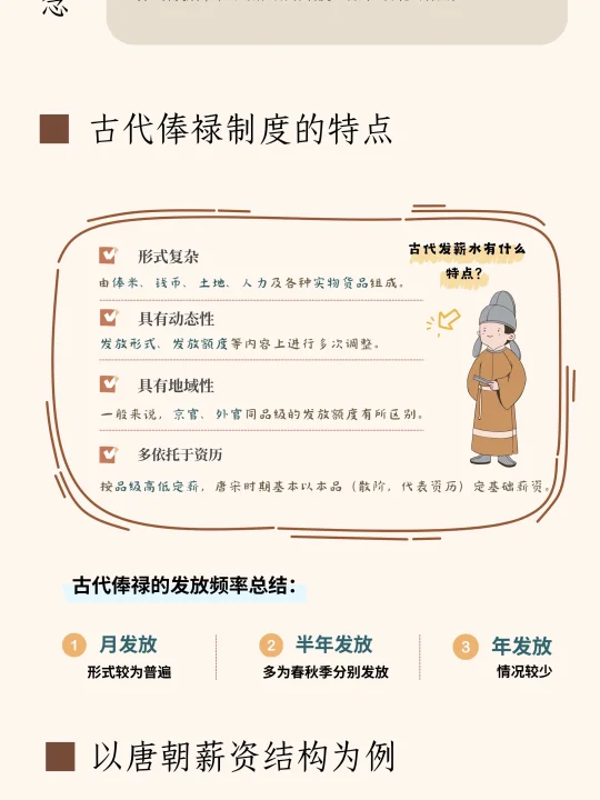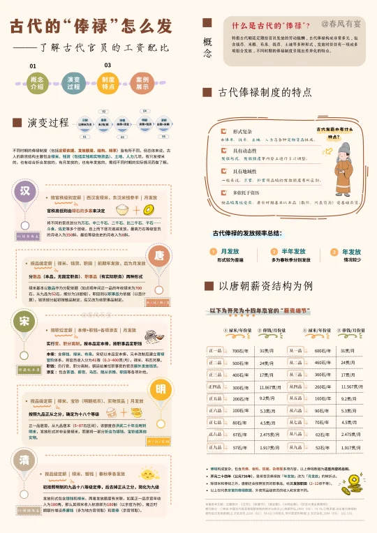 俸禄特指古代朝廷定期给官员发放的劳动报酬,古代俸禄构成非常多元,包含钱币、米粮、布帛、钱币、土地等多种形式,发放时往往由一项或多项组合发放。不同时期的俸禄制度(包括发放额度、形式、频率)呈现出差异化的特点,如: