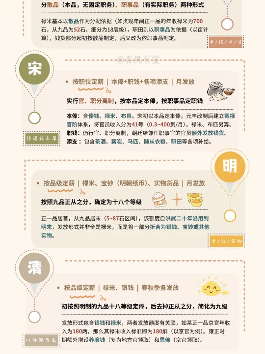 ✨宋朝采取“本俸+职钱+添支”薪资结构,内容包含米粮、钱币、布帛、茶酒、薪炭、马匹、人力、职田等多项,构成形式多元,其定薪依据也有散品(后调整为寄禄官阶)和职事品之分,前者定本俸,后者定职钱。