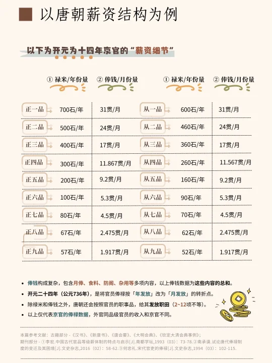 ✨唐朝采取“禄米+钱货+职田”的薪资构成,前期为年发,开元二十四调整为「月俸制」。由于唐朝官品体系的复杂性(分散品和职事品),薪资的发放依据也更为繁复,其中禄米依散品(本品,无实职)而定,职田则按职事品(有实职)而定,且俸禄制度时常调整。