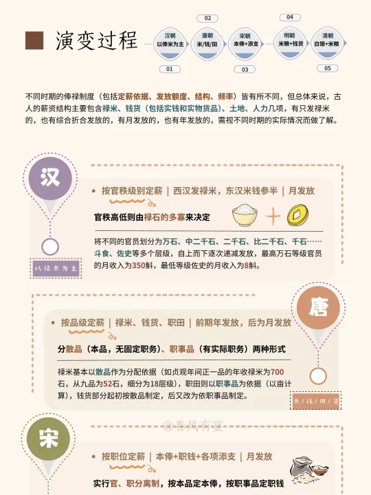 ✨西汉以禄米为主,东汉则改调整为“米钱参半”,为月发,按官秩高低统一定薪。