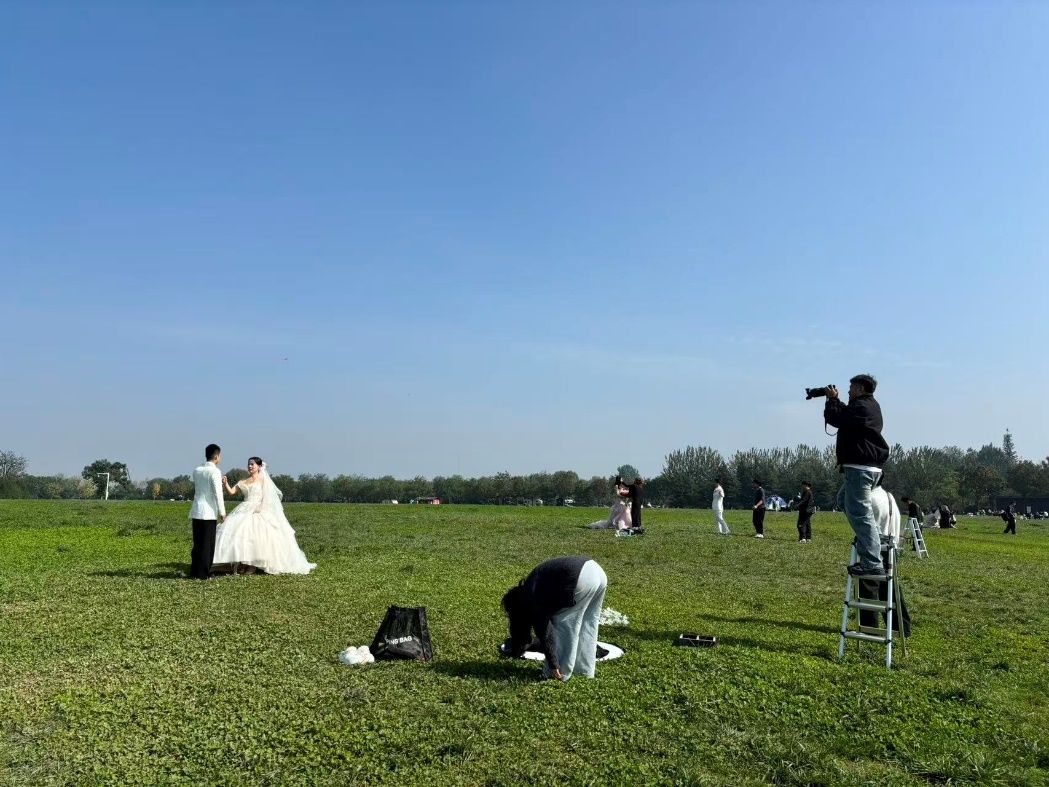 这几天的杜邑,不但搭帐篷支桌子的人多,连拍婚纱照的也多。就在前天中午时分,网红桥旁的小草坪和那个著名的大草坪上,拍婚纱照的就达到了十多对。