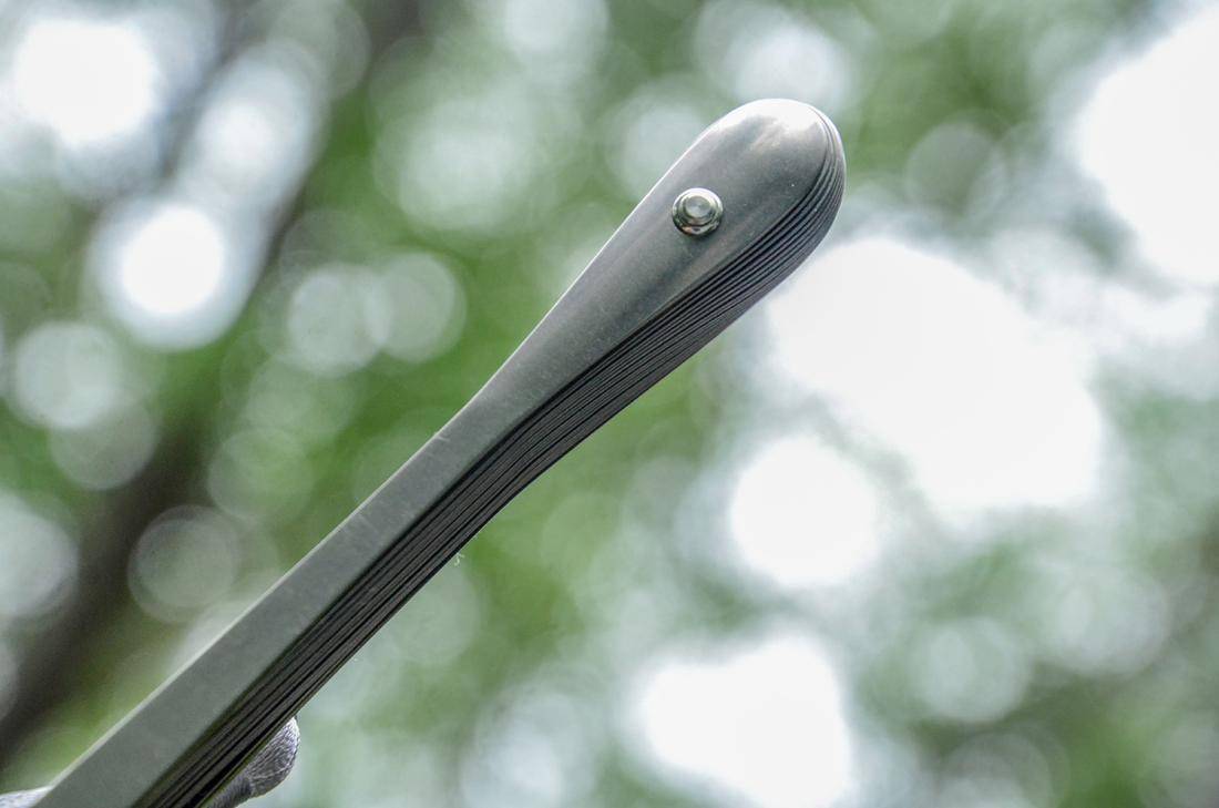 再来看最外侧的两篇大扇骨,大扇骨的厚度为2.5mm,这样就能在尾部将四周打磨减薄,形成更加圆润的外表面,这样一来,从手柄两面,也有能够贴合掌型的外观,符合人体工程学,握持起来当然更加舒适。