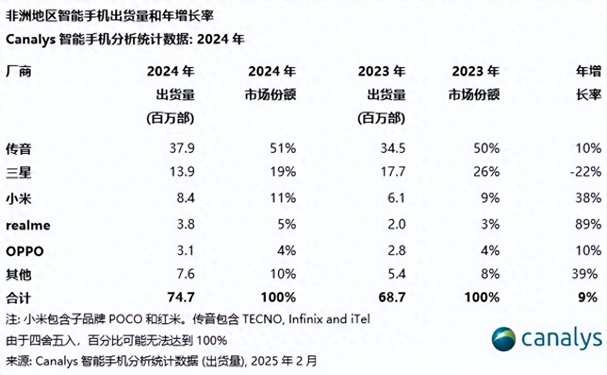 截止2024年,非洲总人口超过14亿,人口这么多手机需求自然也很大,近日Canalys公布了2024年非洲市场手机出货量排名,结果中国手机在非洲市场高歌猛进成绩出色,前五名除了三星都是中国手机,前五名分别是传音、三星、小米、realme、OPPO,前五名的中国手机就占据非洲市场71%份额。