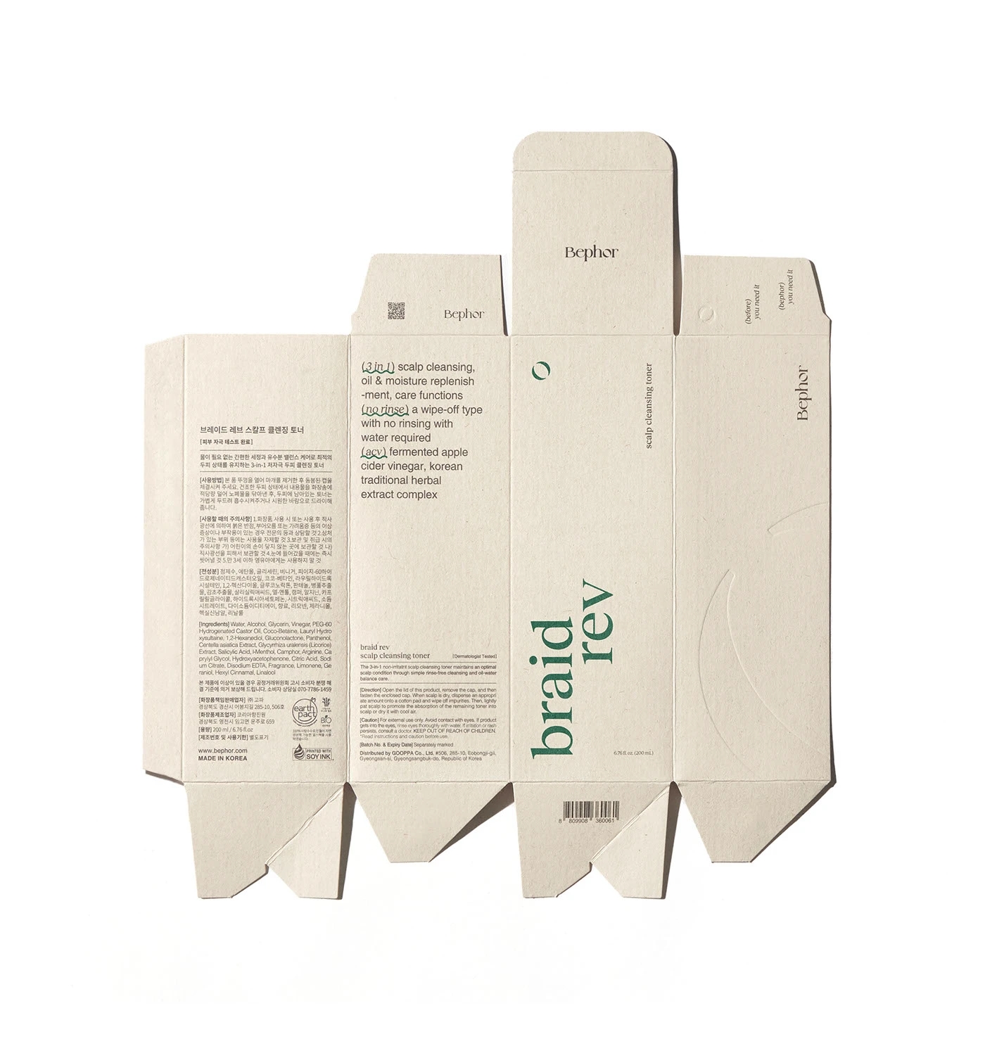 这波包装直接拿捏了 “极简但不简单” 的精髓:米白底色 + 低饱和绿色字体,像给包装穿了件 “莫兰迪色系的亚麻衫”,看着就舒服。最绝的是它的展开盒设计 —— 明明是头皮护理系列,包装却做成了 “能平铺当海报” 的结构,环保纸浆材质自带的纹理感,把 “自然、温和” 的产品调性直接写在脸上,连拆盒都像在拆一份 “治愈系礼物”。
