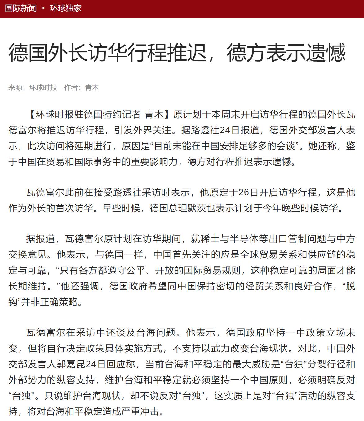 据环球网报道,原计划本周访华的德国外长瓦德富尔,突然在临行前宣布推迟行程。