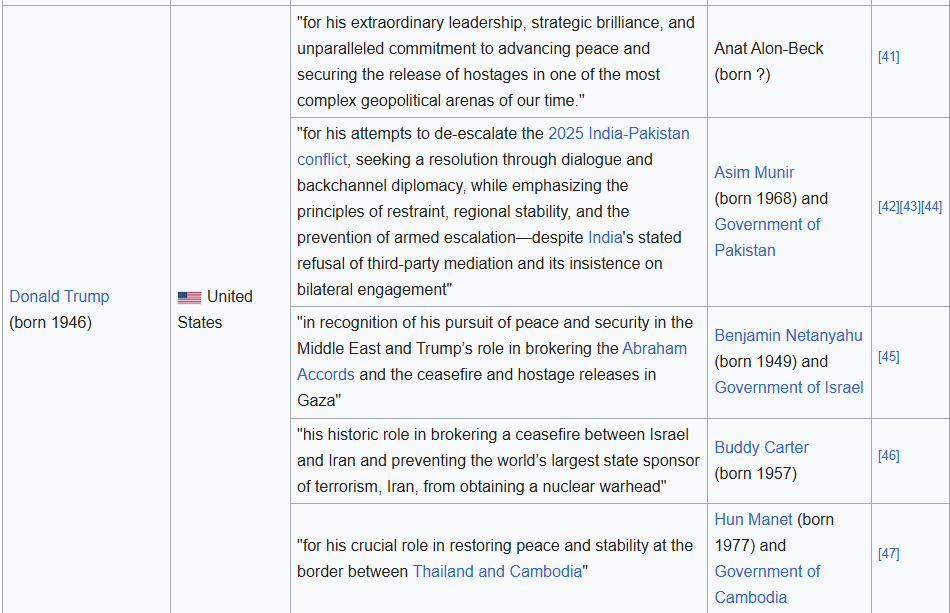 特朗普声称并且得到相当多的符合(拍马屁)的国家支持,据说他给马来西亚开出的访问条件是要泰国和缅甸在他主持下签署和平协议并不准中国人参加,不要脸和对奖项的热切可见一班。