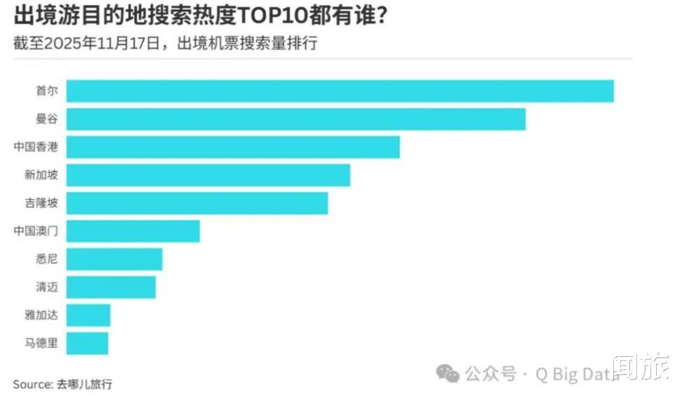 而从机票搜索指数,去哪儿旅行大数据也显示,截至11月17日,韩国首尔是出境机票搜索量最高的目的地,其次就是泰国曼谷。