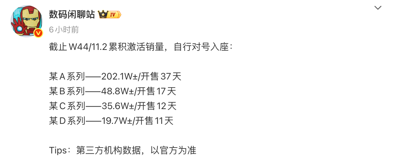 截至 11 月 2 日的数据显示,17、17 Pro 和 17 Pro Max 加一块,累计激活销量已经超过 200W 台。