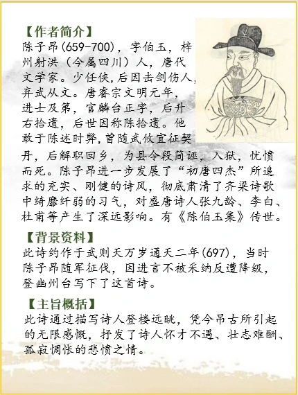 此诗约作于武则天万岁通天二年(697),当时陈子昂随军征伐,因进言不被采纳反遭降级,登幽州台写下了这首诗。