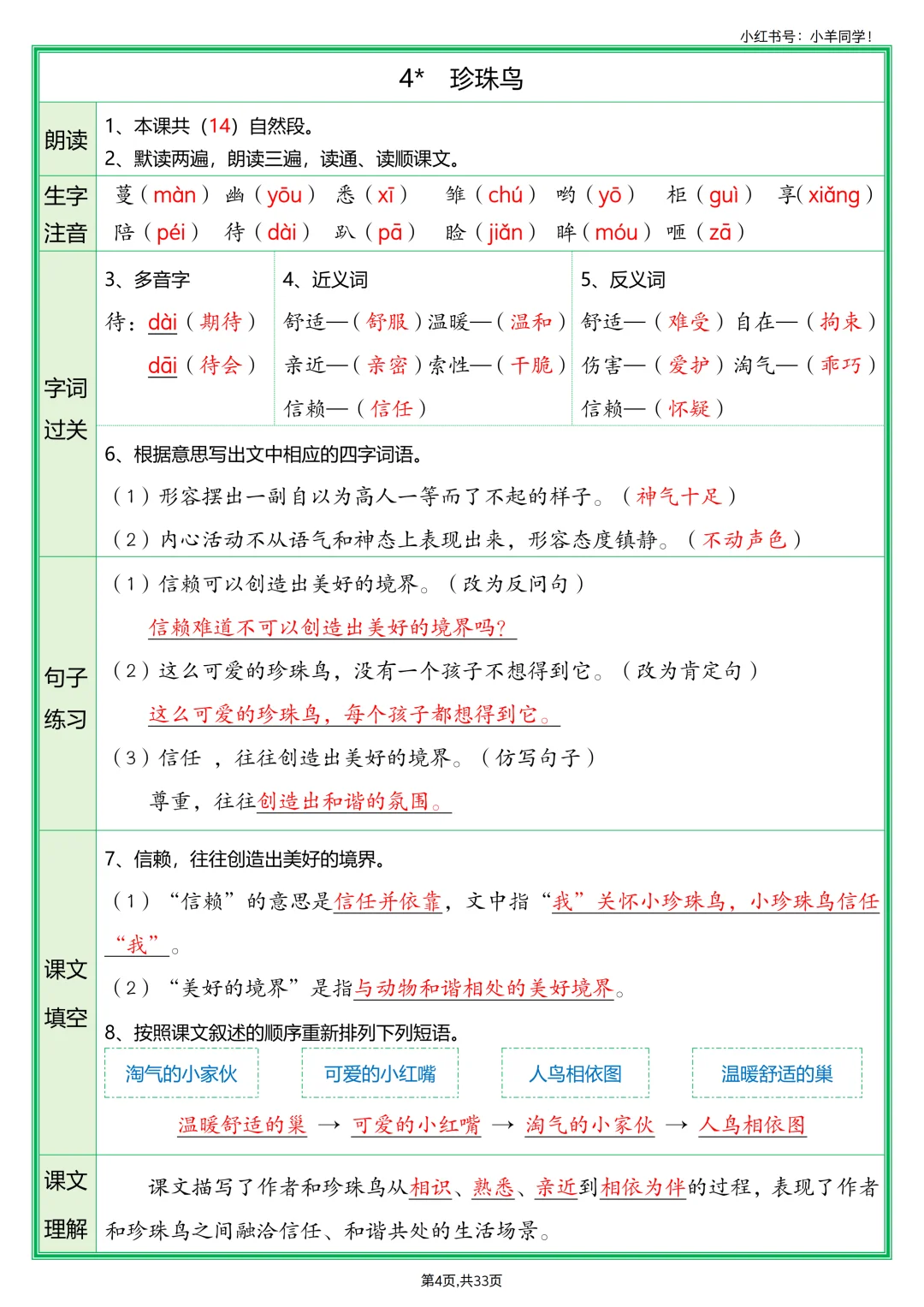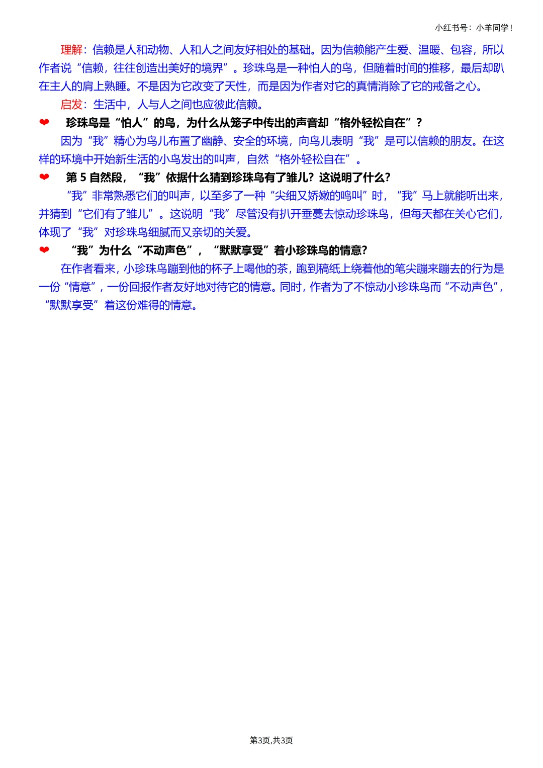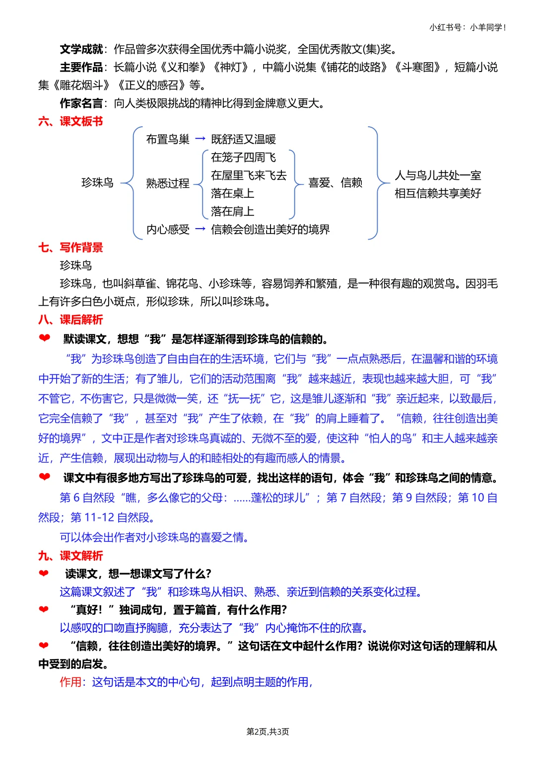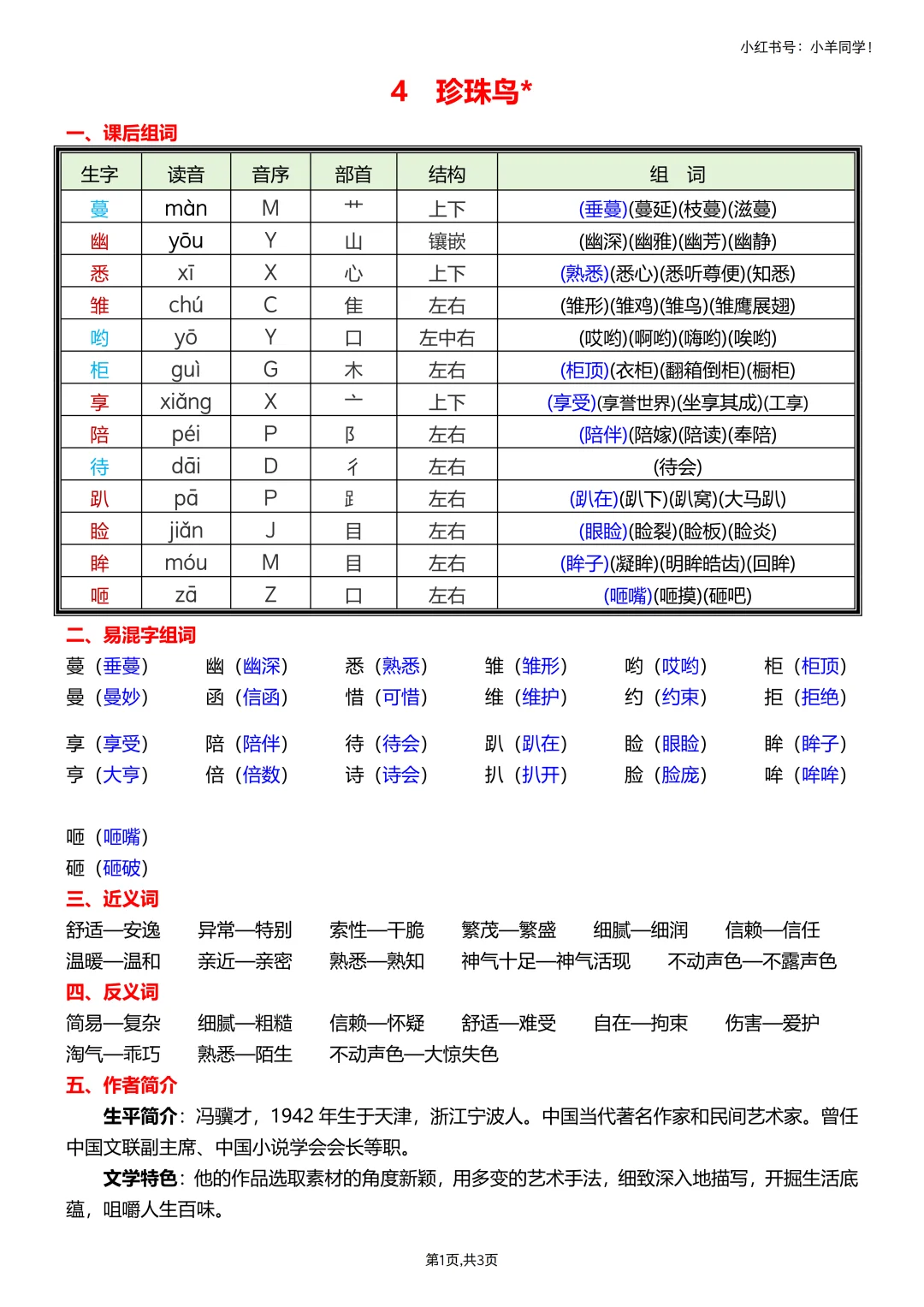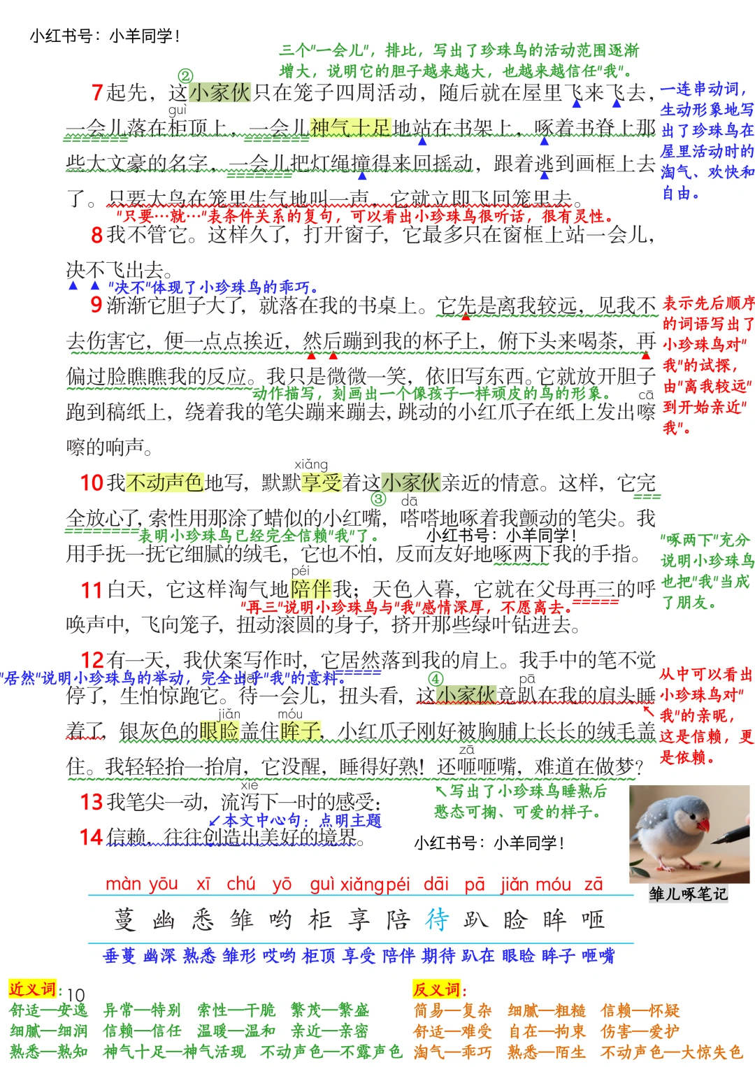 ✅学习目标: 🚩认识“蔓、幽”等 13个生字,读准多音字“待”。 🚩能借助关键语句,体会作者和珍珠鸟之间的情意,了解课文借物抒情的写法。(重点) 🚩能梳理珍珠鸟与作者之间情感变化的线索。(重点) ⚠️原创整理,禁止转载发布网络平台或商用。