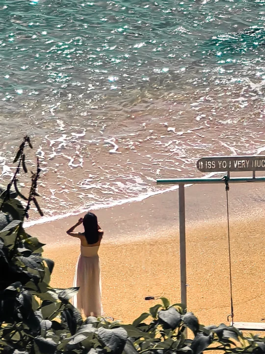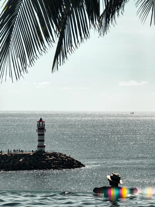 1️⃣图一:被拍摄者在海滩,拍摄者去酒店泳池尽头,打开相机长焦往海滩方向拍摄(注意进入泳池需刷房卡,或和工作人员协商)