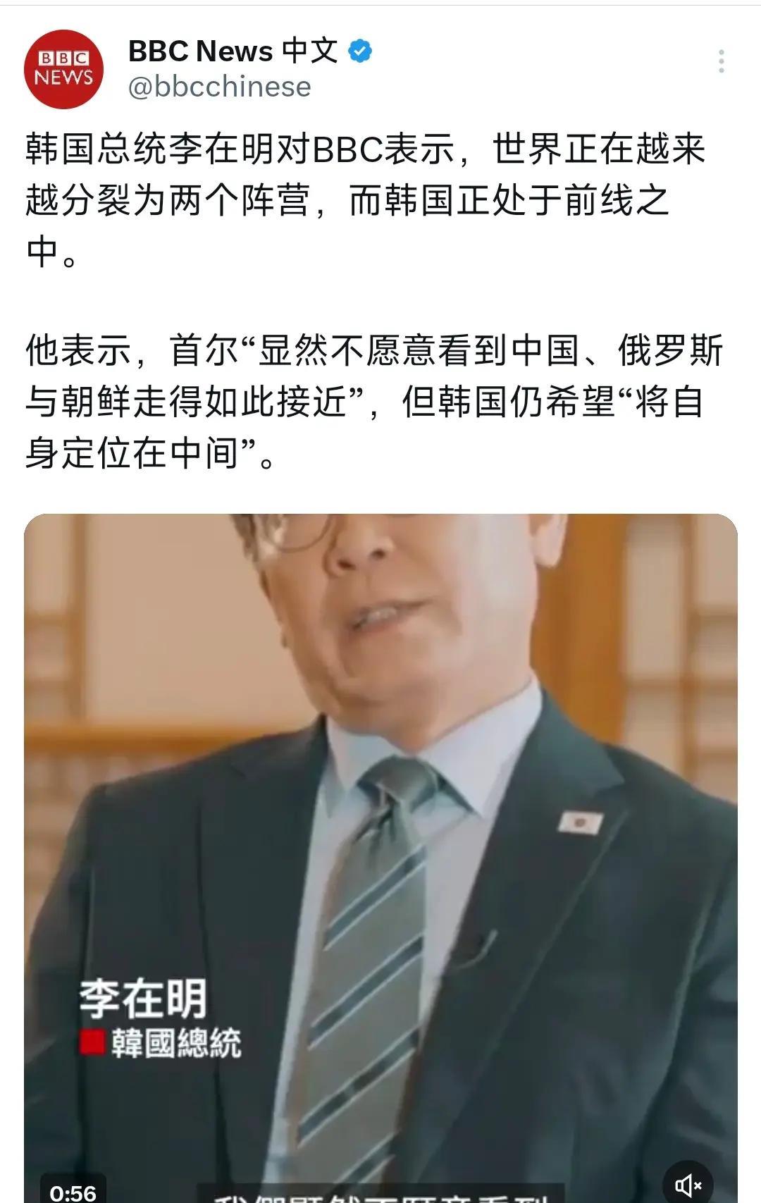 BBC中文网昨晚(9月22日)报道:“韩国总统李在明对BBC表示,世界正在越来越分裂成两个阵营,而韩国正处于前线之中。李在明表示,首尔‘显然不愿意看到中国、俄罗斯与朝鲜走的如此接近’,但韩国仍希望‘将自身定位在中间’。” 李在明在大选时谴责尹锡悦无端破坏中韩关系,上任后做出许多缓和朝韩关系的举措,无论中俄朝关系走近与否,只要不做他国棋子,没有哪个国家针对韩国。真正让李在明政府难以抉择的是,美国要求韩国将目前的美韩军事同盟的适用范围扩展到美国的印太战略之中,不过韩国智库学者劝告李在明政府走中立路线,否则韩国将成为大国博弈中被碾死的“那只小虾”。