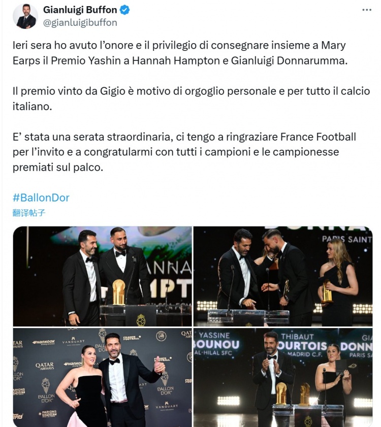 布冯在社媒写道:“昨晚,我很荣幸与玛丽-厄普斯一同将雅辛奖颁发给汉娜-汉普顿和多纳鲁马。多纳鲁马获得的这一奖项是个人以及整个意大利足球的骄傲。这是一个非凡的夜晚,我感谢法国足球的邀请,并祝贺所有在舞台上获奖的冠军们。”