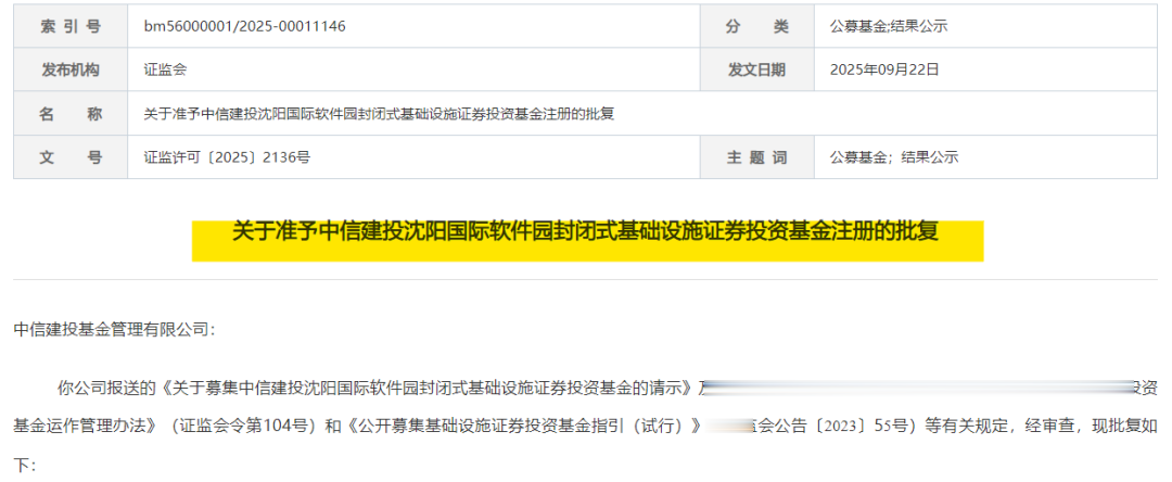 此外,中信建投沈阳国际软件园封闭式基础设施证券投资基金(以下简称沈阳国际软件园公募REITs)也于9月22日获得中国证监会准予注册的批复。这是东北地区首单成功获批的公募REITs项目。