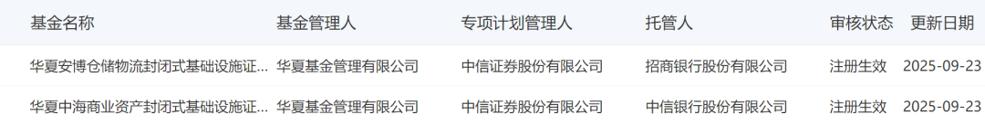 9月23日,深交所网站显示,华夏中海商业资产封闭式基础设施证券投资基金(以下简称华夏中海商业REIT)、华夏安博仓储物流封闭式基础设施证券投资基金(以下简称华夏安博仓储REIT)审核状态均更新为“注册生效”,注册生效日期为9月22日。其中,华夏安博仓储REIT是目前已上市及申报中的仓储物流类REITs中唯一全部资产均位于大湾区的REITs。