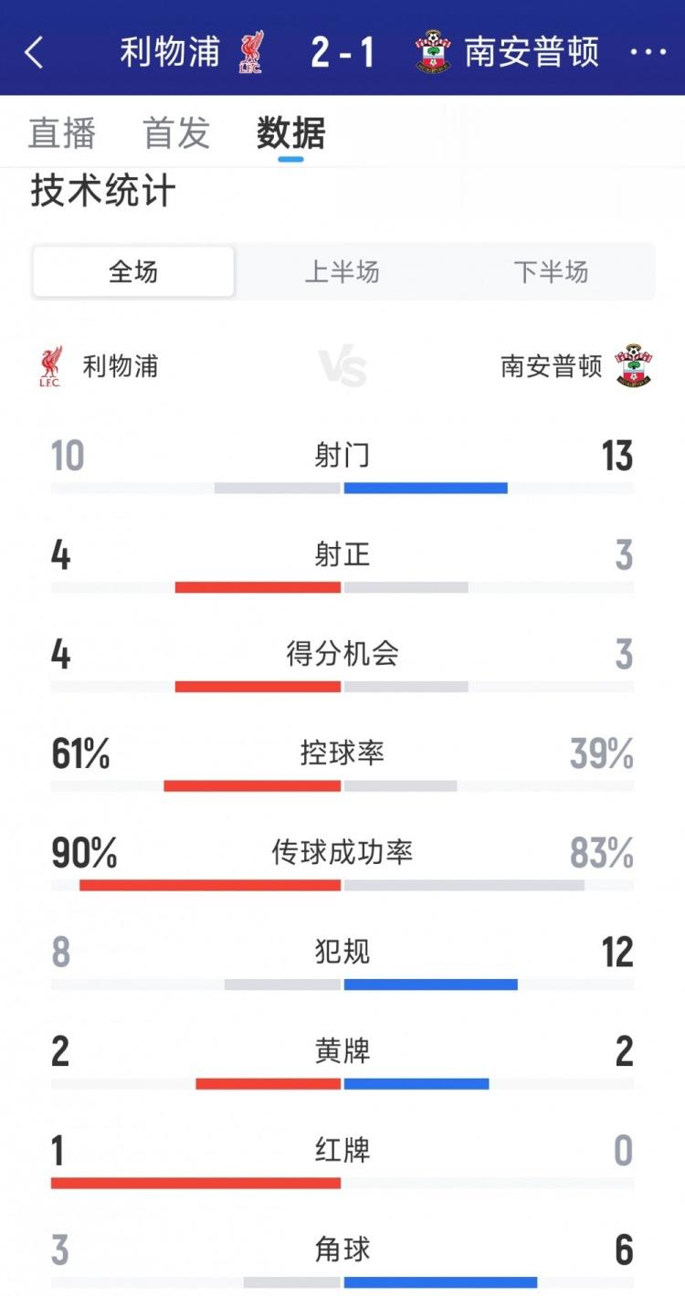直播吧9月24日讯在本轮联赛杯,利物浦2-1击败南安普顿。以下为双方本场数据对比: