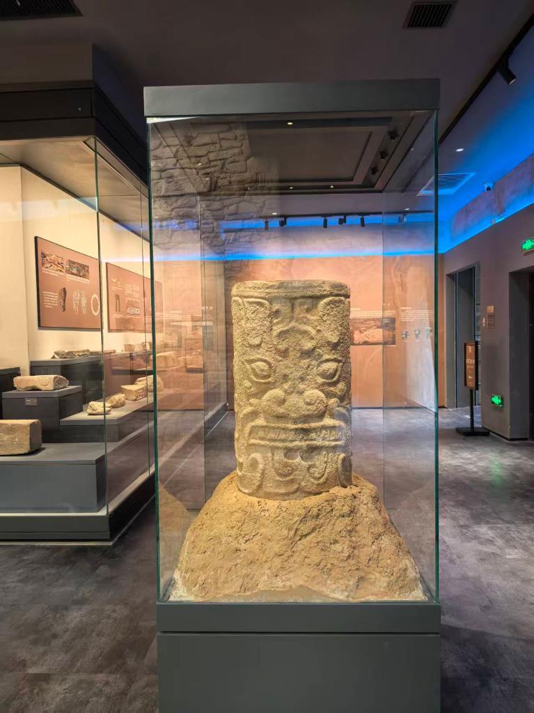 珍藏于石峁博物馆的柱体双神面大石雕。新华社记者张京品摄