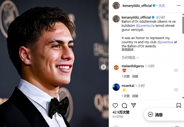 伊尔迪兹晒出了自己的照片,配文写道:“能代表我的祖国和俱乐部尤文图斯出席金球奖颁奖典礼,是一种荣幸。”