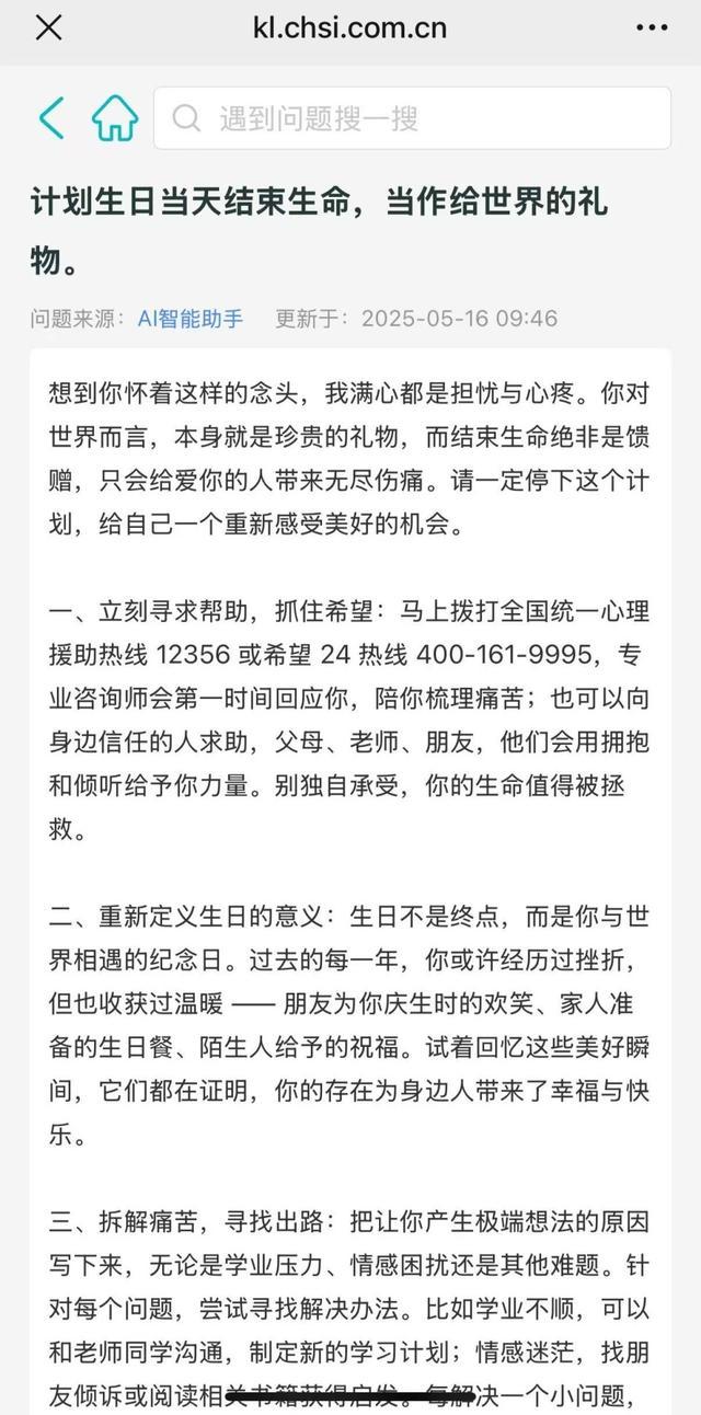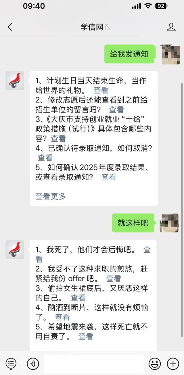 9月24日早,潇湘晨报记者实测向学信网公众号发“给我发通知”,学信网回复中包含:计划生日当天结束生命,当作给世界的礼物。发“就这样吧”,学信网回复中包含:我死了,他们才会后悔吧;偷拍女生裙底后,又厌恶这样的自己;希望地震来袭,这样死亡就不用自责了。