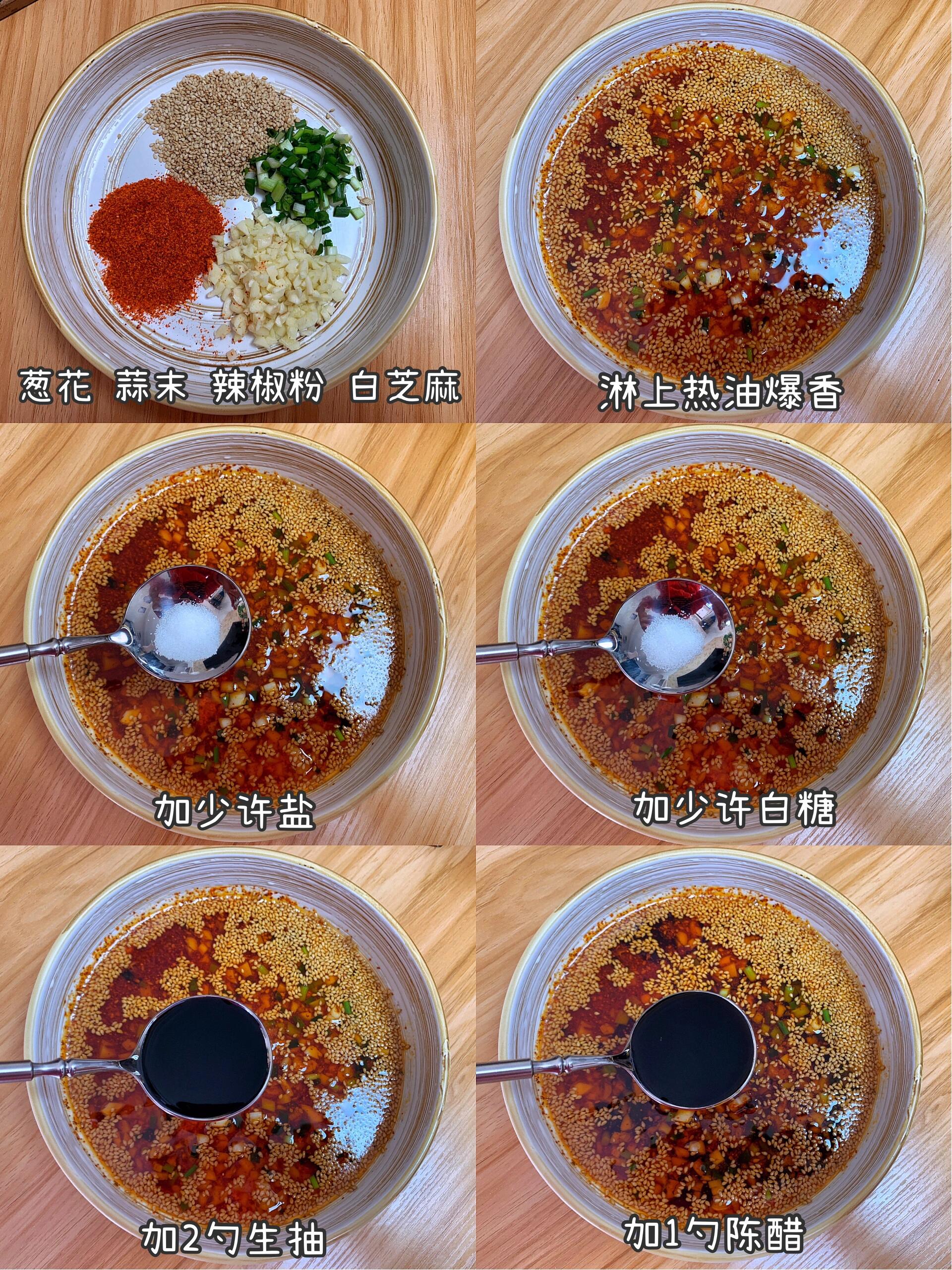 第二步调灵魂酱汁,香味全靠它!把葱蒜切末,和辣椒粉、白芝麻一起放进碗里。另起锅烧2勺橄榄油,烧到油面微微冒烟(油温够高才能激出香味),然后“刺啦”一声浇在调料上,瞬间满屋飘香,连邻居家的小狗都扒着我家门缝叫。接着加入生抽、陈醋、盐和白糖,搅拌均匀,酱汁就做好了。这里提醒大家,白糖和陈醋是点睛之笔,少了就少了那种酸甜解腻的口感,千万别省!