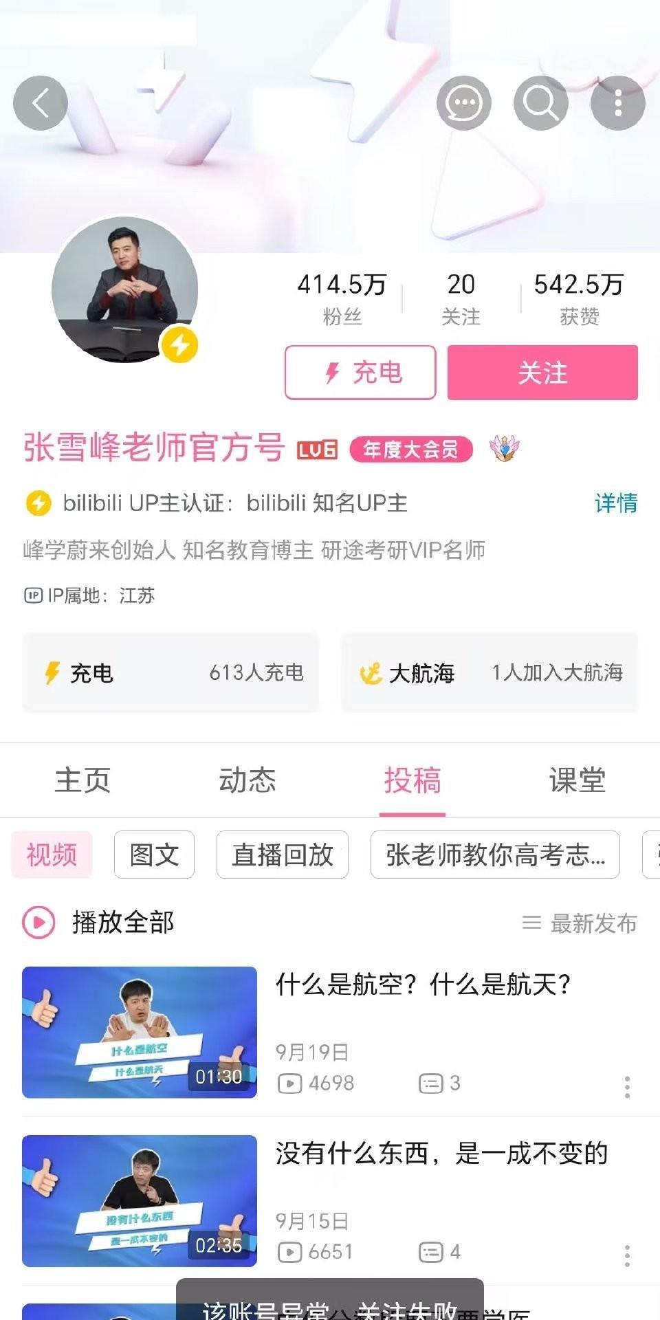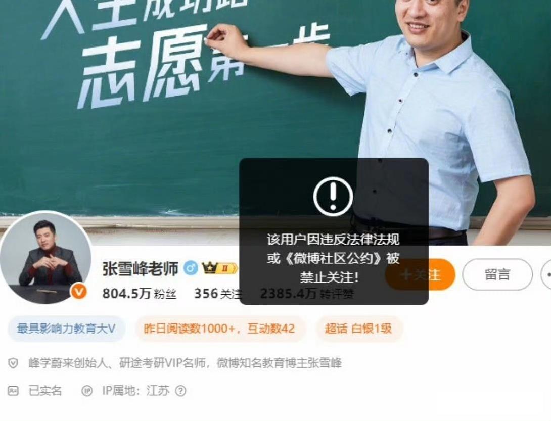 突发:张雪峰多个社交平台账号被禁止关注! 消息来源:国内媒体 据国内媒体报道,9月24日张雪峰多个社交平台账号被禁止关注,这其中包括:微博、抖音、B站、小红书四大平台! 在点击关注时平台提示:因违反法律法规或社区公约”导致功能受限。 就此事有记者电话询问其团队客服,但客服只是回应:不清楚,后续在看! 提到张雪峰大家都应该比较熟知,他在网络上属于真正的大V级别,近期让他一夜爆火的事件,应该就是9月3日他的那句言论:“若祖国统一战争打响,个人捐5000万,公司捐1亿”。 该话题在24小时之内,全网络获得了20亿次曝光,他公司的咨询量也暴涨37%。 封禁主账号但保留业务号,表明监管可能针对其个人言论而非整体商业模式,此前张雪峰就表示过“离被人搞不远了”,“可能停播,动了太多人蛋糕”。 此次事件表明张雪峰个人频繁卷入舆论漩涡,平台或因持续争议触发内容治理机制,而对其实行了惩罚!