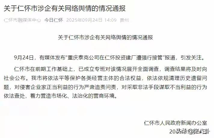 八亿投资建厂,大门却进不去?仁怀市回应了 一纸解除合同通知书,撵人接管厂房,法院说没用,可投资方在自家厂门口一站就是三年。 重庆泰克环保科技公司的唐显策怎么也没想到,自己响应招商引资带来的八个亿,在茅台镇建起的大型白酒废水处理厂,会在一纸通知下瞬间易主。他和工作人员被撵出厂房,法院认定那份解除合同通知书没有法律效力,可三年过去了,他们还是连厂门都进不去。 “饭刚做好被连锅端走”,唐显策这样形容自己的遭遇。 事件曝光后,仁怀市政府新闻办公室在9月24日迅速发出通报。通报承认媒体报道引发关注,并表示已成立专班全面调查。市政府承诺将依法平等保护各类经营主体,清理历史遗留问题。 (素材来大象新闻)