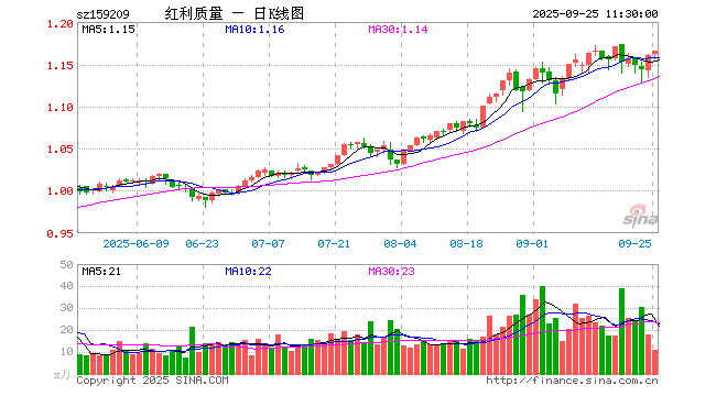 9月25日,截止午间收盘,中证红利质量ETF(159209)涨0.43%,报1.165元,成交额1281.64万元。中证红利质量ETF(159209)重仓股方面,福耀玻璃截止午盘跌0.57%,贵州茅台跌0.07%,新和成涨0.76%,南山铝业涨0.26%,山金国际跌2.48%,海天味业涨0.10%,亿联网络涨2.07%,吉比特涨4.15%,格力电器跌0.93%,药明康德涨3.03%。