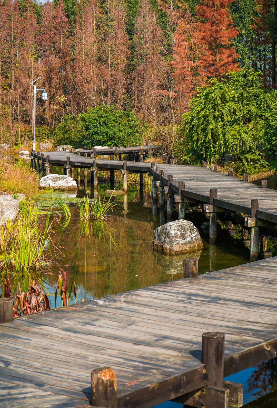 水杉林面积比较大,小湖中间有栈道穿行