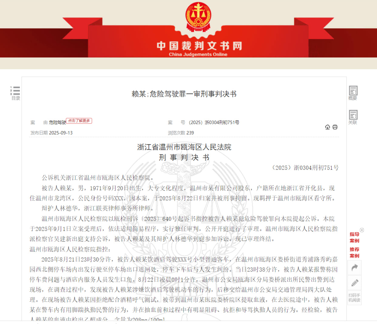 9月25日,大河报《看见》记者从中国裁判文书网获悉,浙江省温州市瓯海区人民法院近日公布了该案的刑事判决书,判决赖某犯危险驾驶罪,判处拘役2个月,并处罚金4000元。