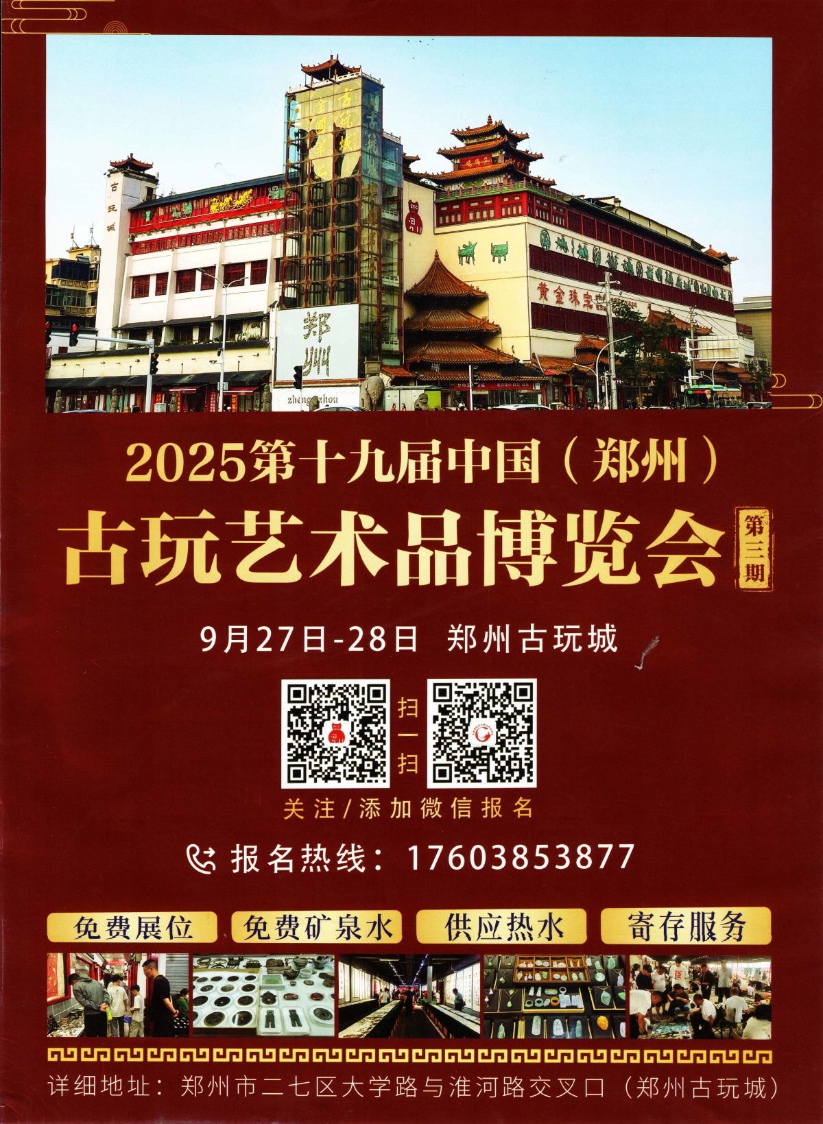 郑州古玩城文化惠民活动:9月27日、28日,举办“第十九届中国(郑州)古玩艺术品博览会”,展览古玩字画、珠宝首饰、民间收藏品等;还有“月满华诞古韵新生——喜迎郑州古玩城三十周年文艺演出”活动,届时将邀请多位艺术家现场表演语言和戏曲类节目。