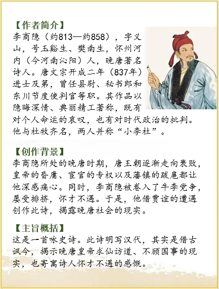 这是一首咏史诗。此诗明写汉代,其实是借古讽今,揭示晚唐皇帝求仙访道、不顾国事的现实,也寄寓诗人怀才不遇的感慨。