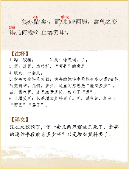 狼也太狡猾了,但一会儿两只都被杀死了,禽兽的诡诈手段能有多少呢?只是增加笑料罢了。