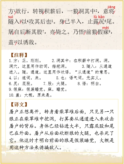 屠户正想离开,转身看柴草堆后面,只见另一只狼正在柴草堆中挖洞,打算要从通道进入来攻击屠户的背后。身体已经钻进大半,只露屁股和尾巴在外面。屠户从后面砍断狼的大腿,也杀死了它。他这时才明白前面的狼是假装睡觉,大概是用这种方法来诱骗敌人。