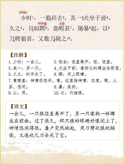 一会儿,一只狼径直离开了,另一只像狗一样蹲坐在前面。过了很久,那只狼的眼睛好像闭上了,神情悠闲得很。屠户突然跳起,用刀劈砍狼的脑袋,又连砍几刀杀死了它。