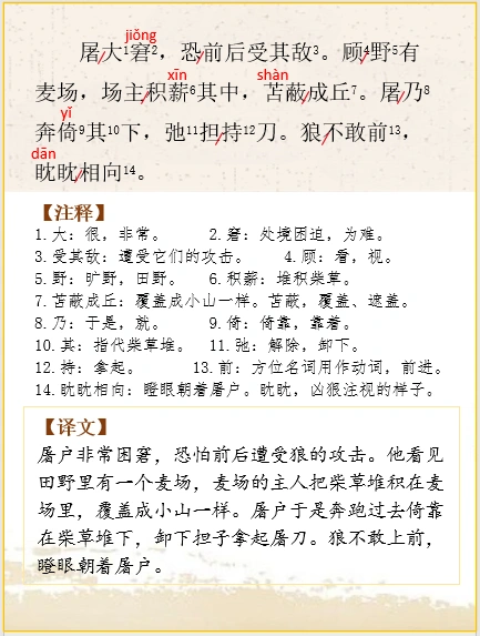 屠户非常困窘,恐怕前后遭受狼的攻击。他看见田野里有一个麦场,麦场的主人把柴草堆积在麦场里,覆盖成小山一样。屠户于是奔跑过去倚靠在柴草堆下,卸下担子拿起屠刀。狼不敢上前,瞪眼朝着屠户。